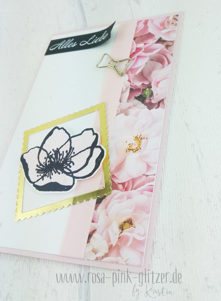 Der Rahmen in Gold bringt das Blümchen richtig schön zur Geltung. Letzteres ist mit Dimensionals geklebt.