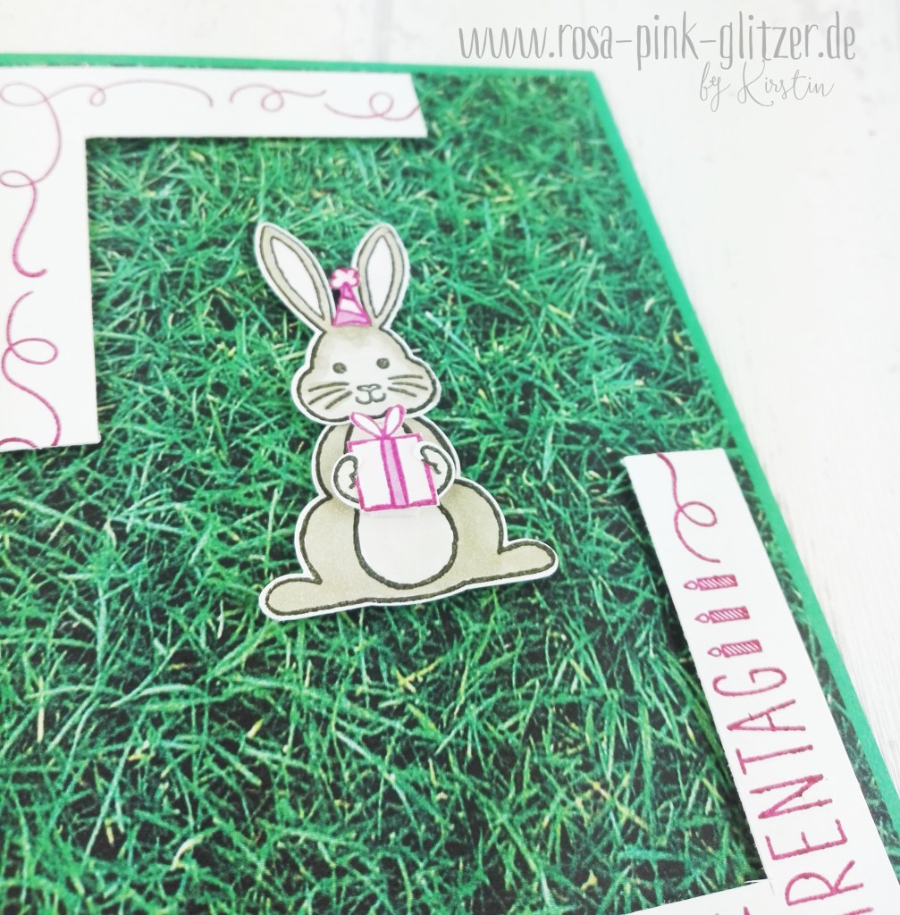 Meine Karte ist ein wenig hasig geworden. Ich hab dafür das neue Hasengrüße-Stempelset eingeweiht und den Hasi auf eine Wiese gesetzt.
