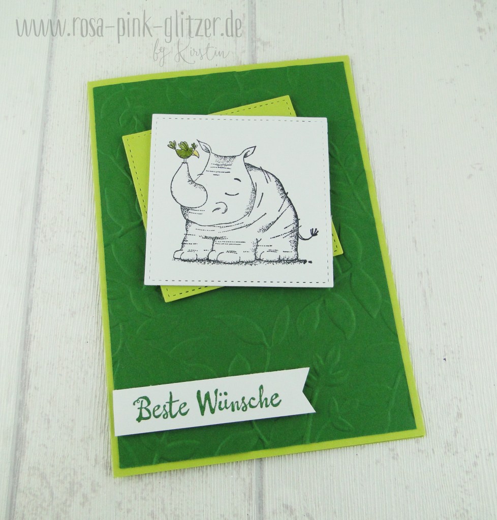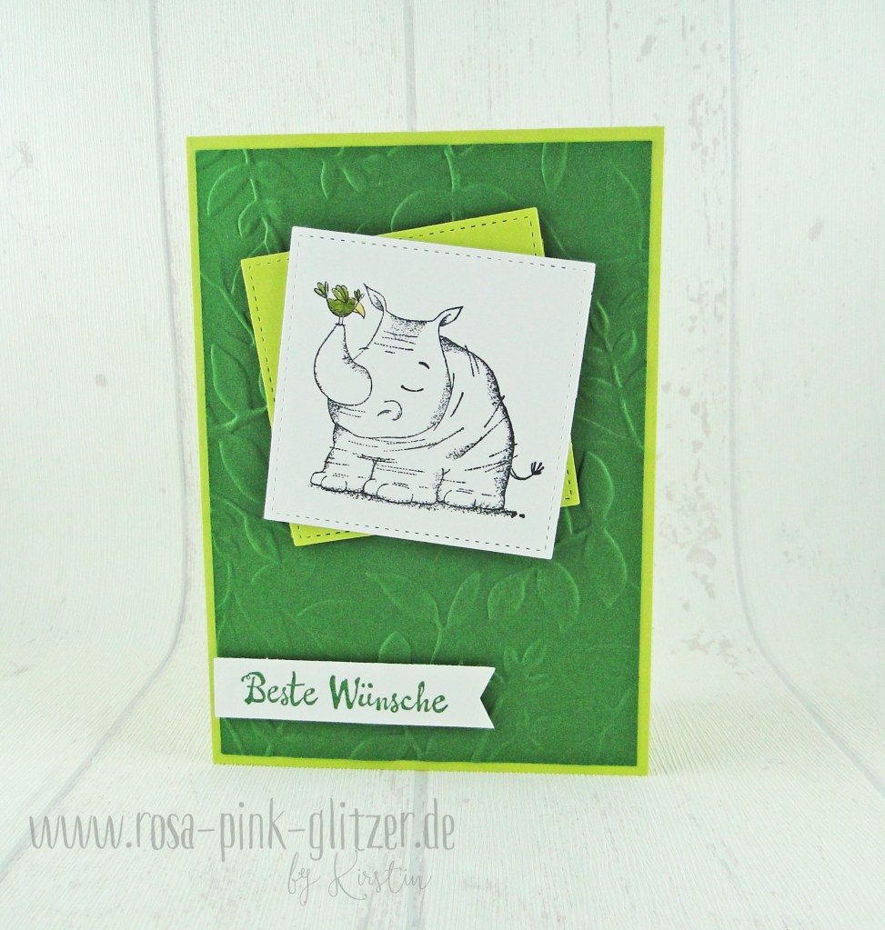 Die Farben sind Gartengrün und Limette. Ich hatte versucht, das Nashorn zu colorieren… Puh, das muss ich noch üben. Die Blends sind irgendwie zu dunkel, das sieht total doof aus. Und Aquarell-Stifte waren mir grad zu mühsam. Aber das Nashorn ist so süß, das sieht auch so gut aus 😉