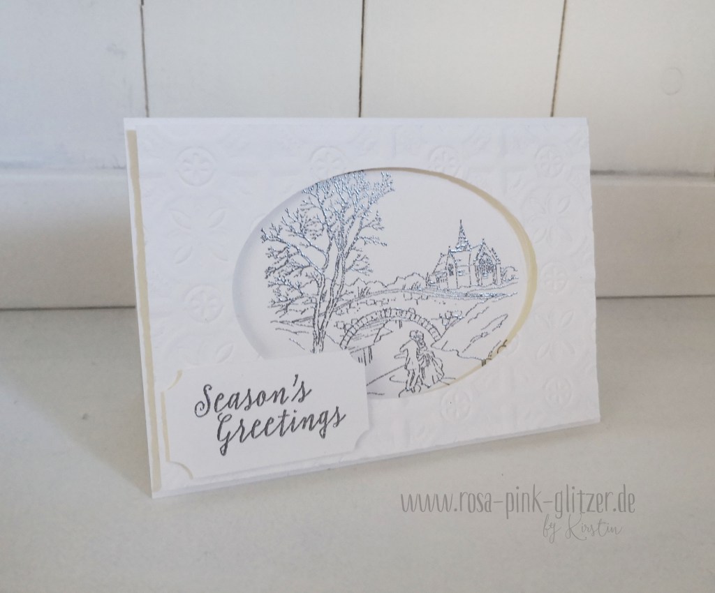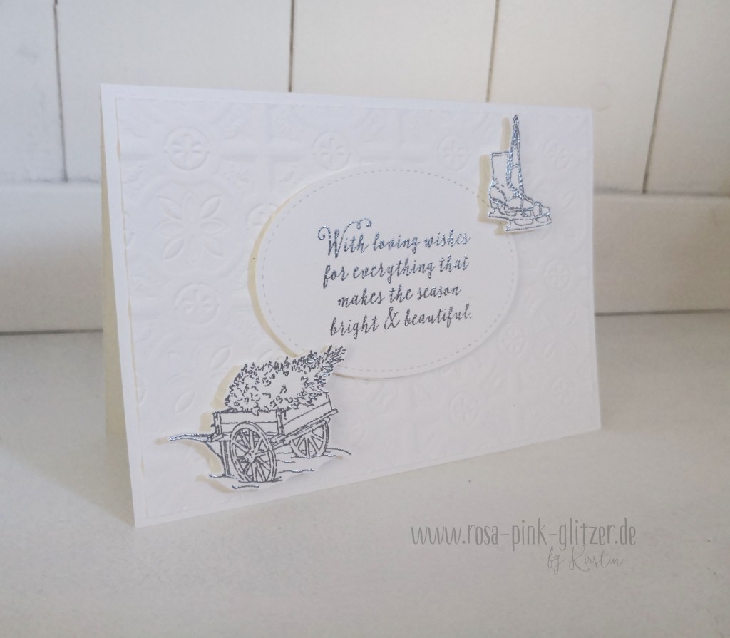 Bei dieser Karte hab ich das große Motiv in silber embosst und hinter einen ovalen Rahmen gepackt. Dazu ein Schildchen mit dem ebenfalls in silber embossten Spruch. Den Rahmen habe ich geprägt. Der Prägefolder ist ebenfalls im neuen Herbst-Winter-Katalog zu finden.