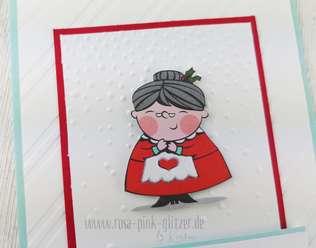 Die Elfen-Oma hab ich aus dem Designerpapier mit der Papierschere ausgeschnitten. Ich liebe dieses Papier. Wie Ihr an der Schürze seht, ist das Papier zum Teil beflockt. Das gibt dem ganzen nochmal sowas besonderes.