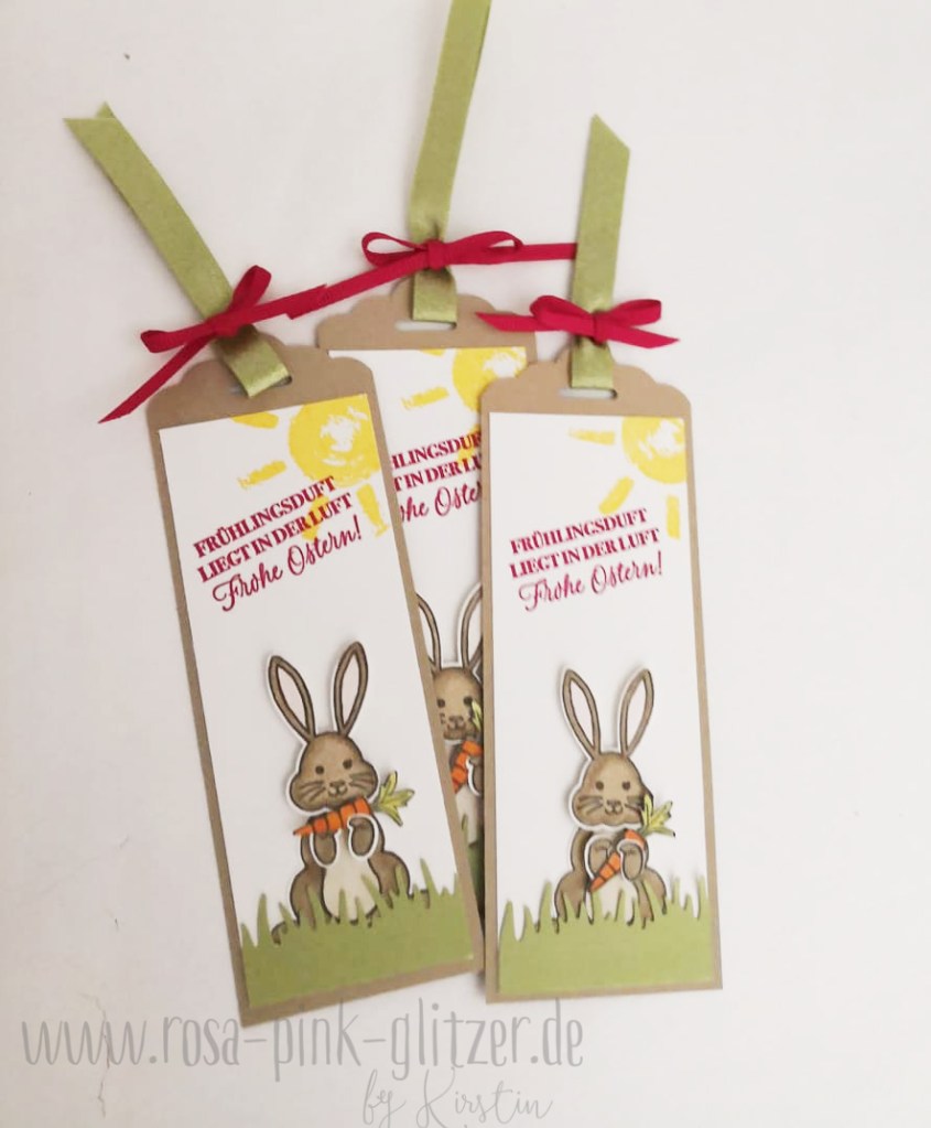 Ich hab kleine Osteranhänger mit dem süßen Hasen aus dem Stempelset „Hasengrüße“, zu finden im Stampin up Hauptkatalog, gebastelt: