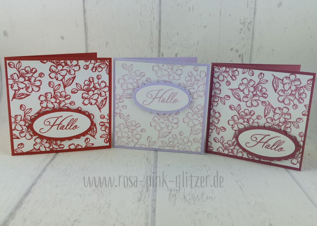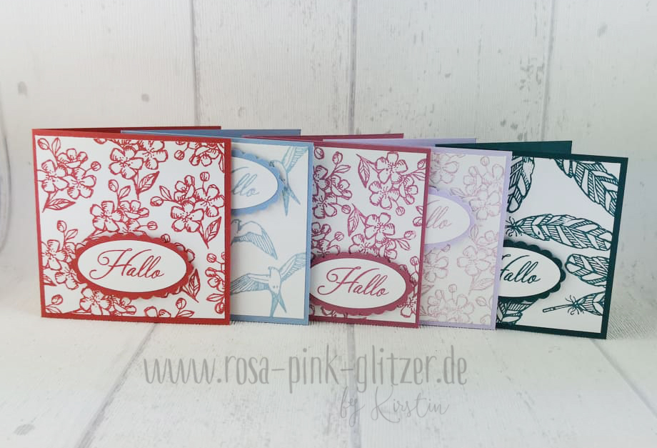 Ich hab Euch die Stempelkissen mitfotografiert. Und, merkt Ihr den Fehler? Genau, sind nur 4 Stempelkissen aber 5 Farben. Denn wie der ein oder andere vielleicht schon mitbekommen hat, ist das Stempelkissen in Flieder derzeit leider nicht lieferbar. So habe ich mit einer ganz alten Farbe von Stampin up – Pflaumenzart – improvisiert.
