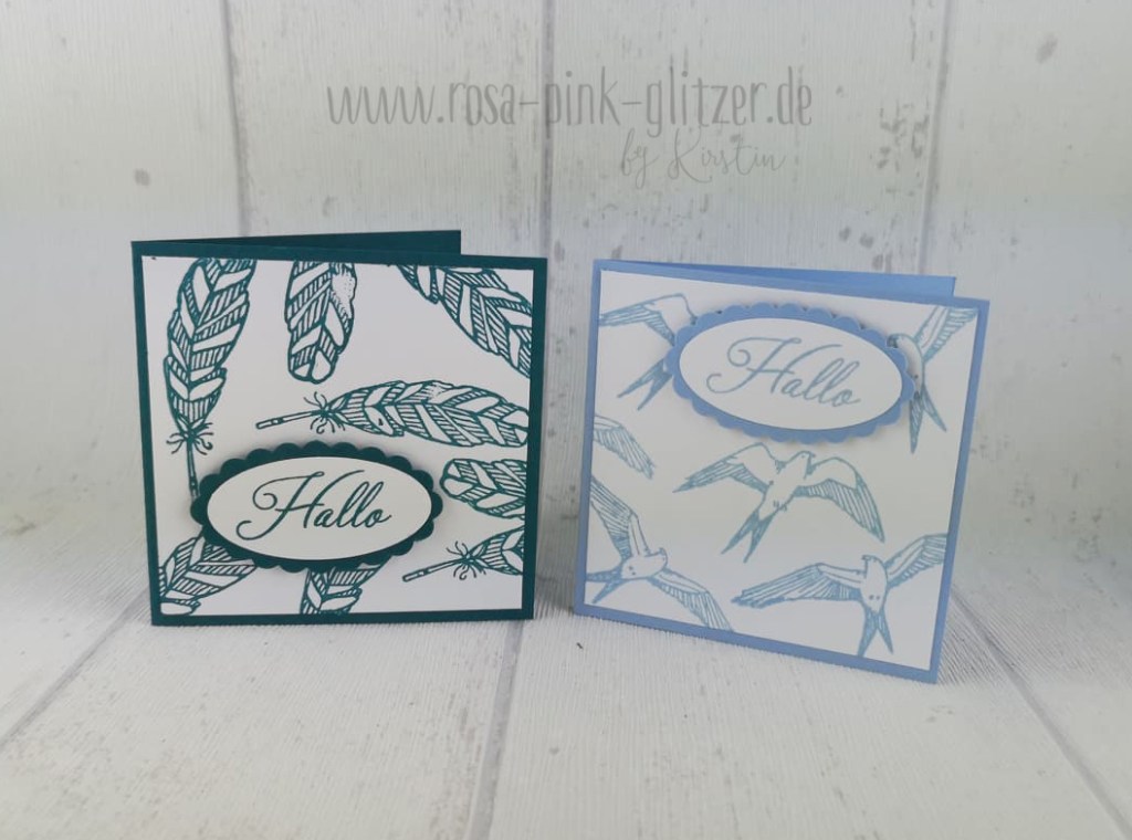 Und hier seht Ihr zwei fedrige Stempel aus dem Set. Einmal die Vögel und einmal die Feder. Hübsch, nicht wahr?
