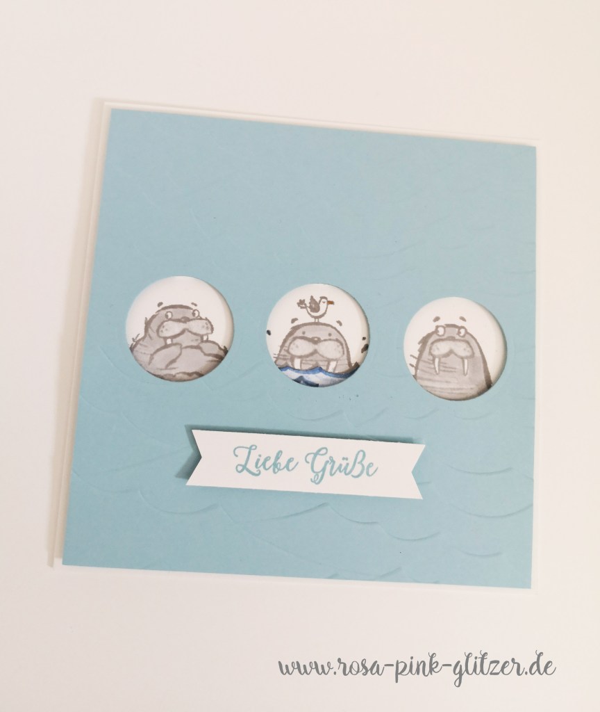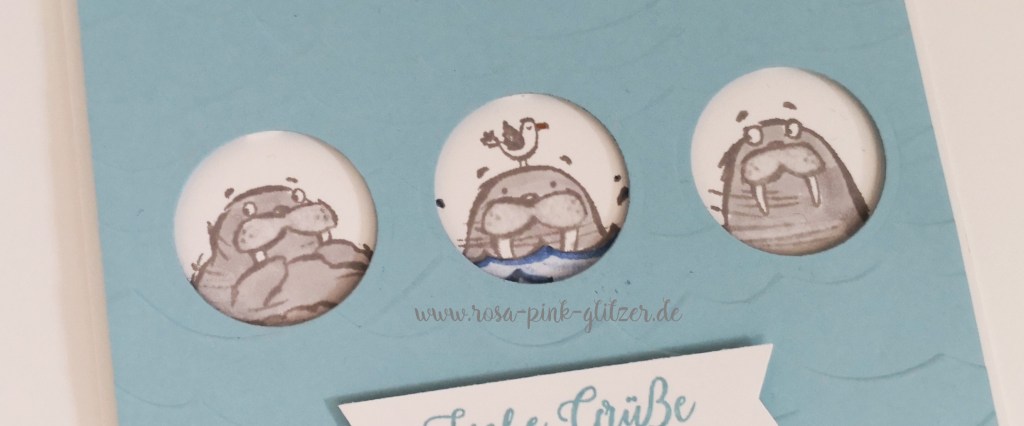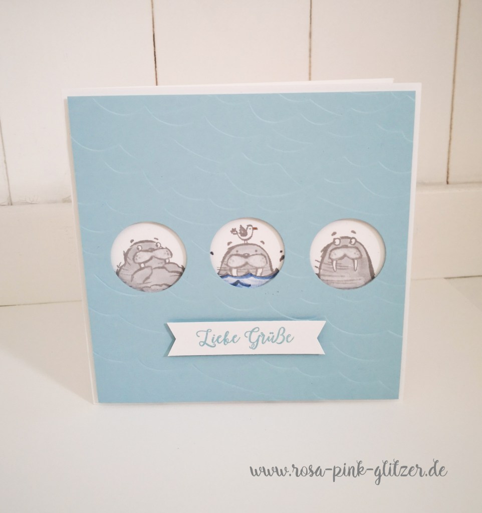 Auf meiner Karte erscheinen gleich drei neugierige Gesellen – die süßen Walrösser, die im neuen Stampin up Katalog zu finden sind.