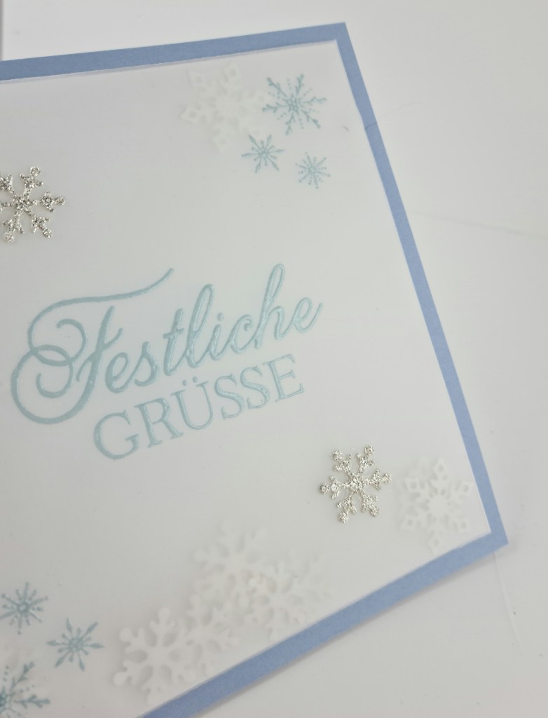 Der Schriftzug und die blauen Schneeflocken sind embosst. Auf Pergament ist das toll, man kann mit einem normalen Stempelkissen in beliebiger Farbe stempeln und dadurch, dass die Tinte auf Pergamentpapier kaum trocknet, mit Embossingpulver in transparent embossen.