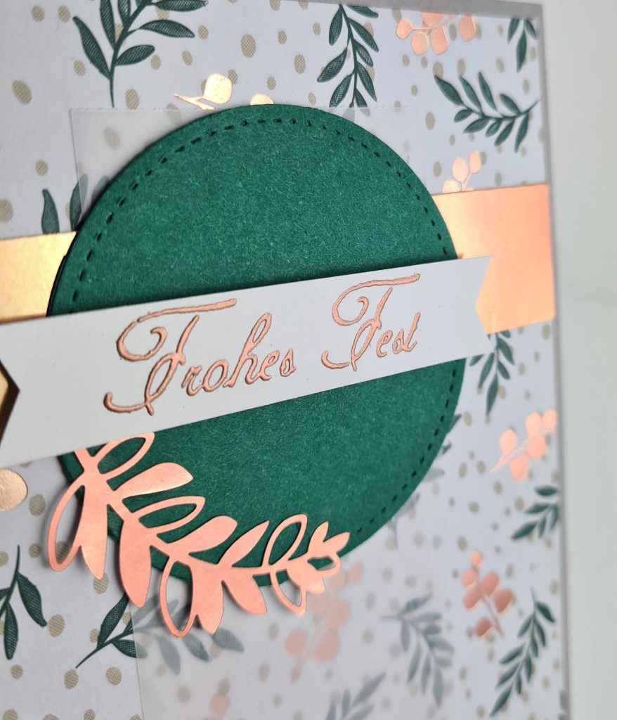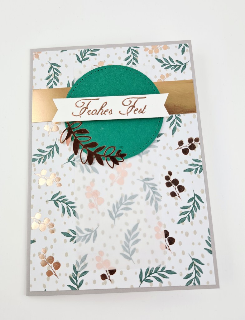 Das Rechteck in der Mitte hab ich mit Pergament gestaltet, weil ich das hübsche Designerpapier einfach nicht so ganz verstecken wollte. Erst hatte ich überlegt, noch Merlot mit reinzunehmen. Aber dann gefiel es mir etwas reduzierter – wenn man mit dem vielen Kupfer davon überhaupt sprechen kann.