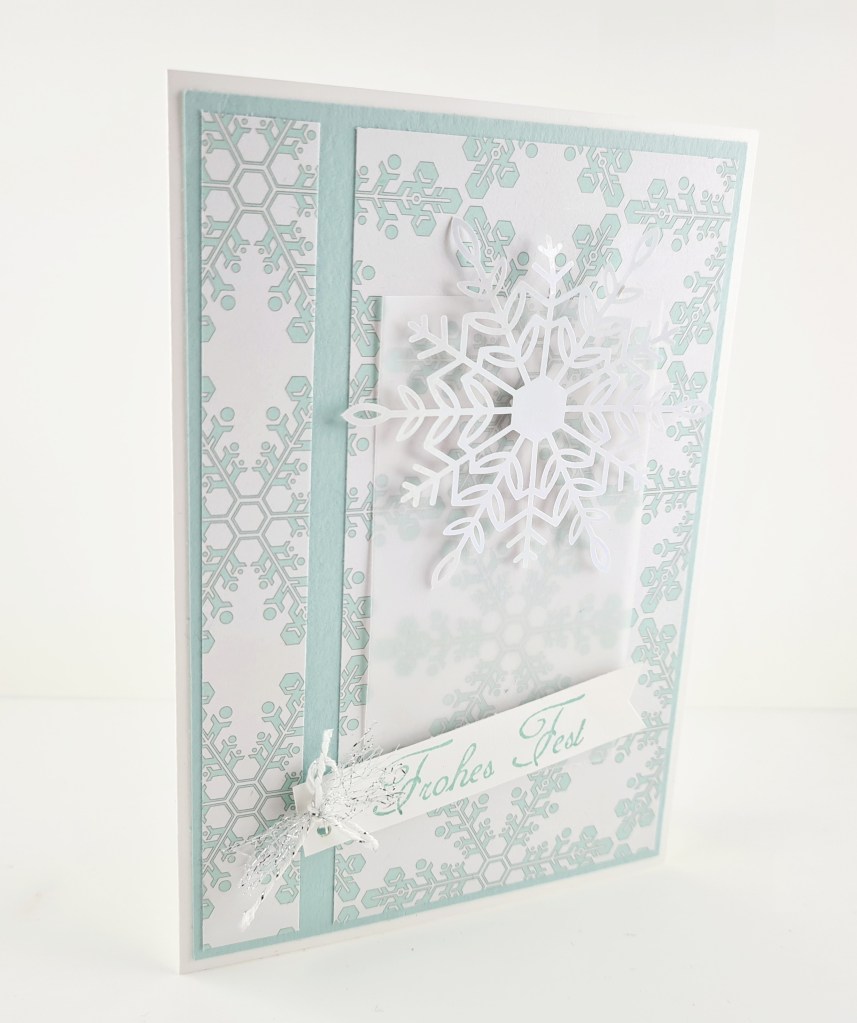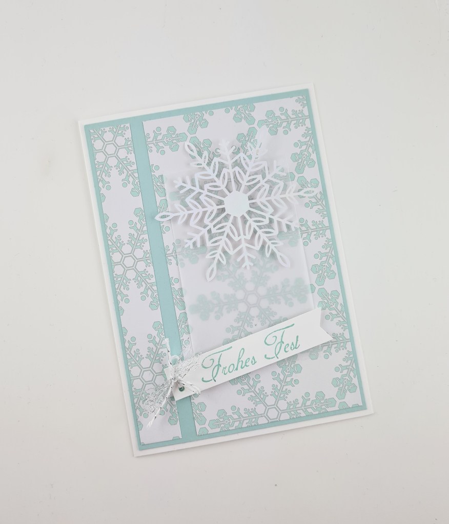Dazu eine der hübschen Schneeflocken aus dem letzten Saisonkatalog von Stampin up, Pergament, ein Text-Tag und ein wenig Band – fertig ist die hübsche Karte.