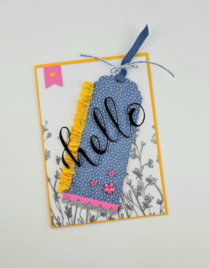 Ich mag diesen ausgestanzten Schriftzug. Ist nicht so ganz einfach, ihn mit Dimensionals aufzukleben, klappt aber 😉 Das Band in Mango hab ich in Falten gelegt. War nicht so ganz einfach, sieht aber hübsch aus finde ich.