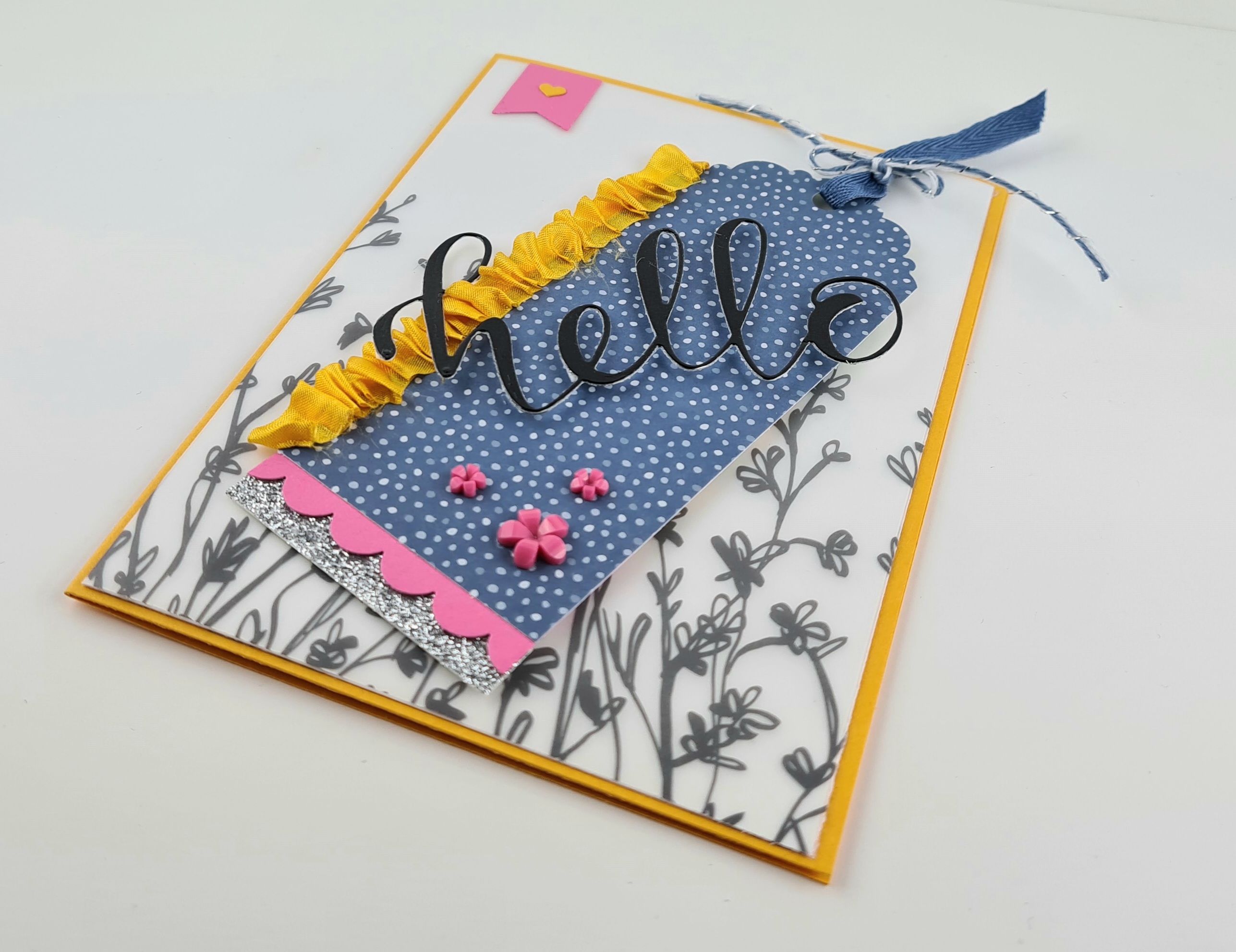 Ich mag diesen ausgestanzten Schriftzug. Ist nicht so ganz einfach, ihn mit Dimensionals aufzukleben, klappt aber 😉 Das Band in Mango hab ich in Falten gelegt. War nicht so ganz einfach, sieht aber hübsch aus finde ich.
