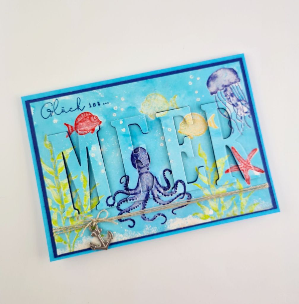Ich habe zuerst die ganzen Fische, Pflanzen etc. gestempelt und dann klar embosst. Danach kam das Türkis und schließlich Buchstaben ausgestanzt und dann war sie ja eh schon fast fertig.