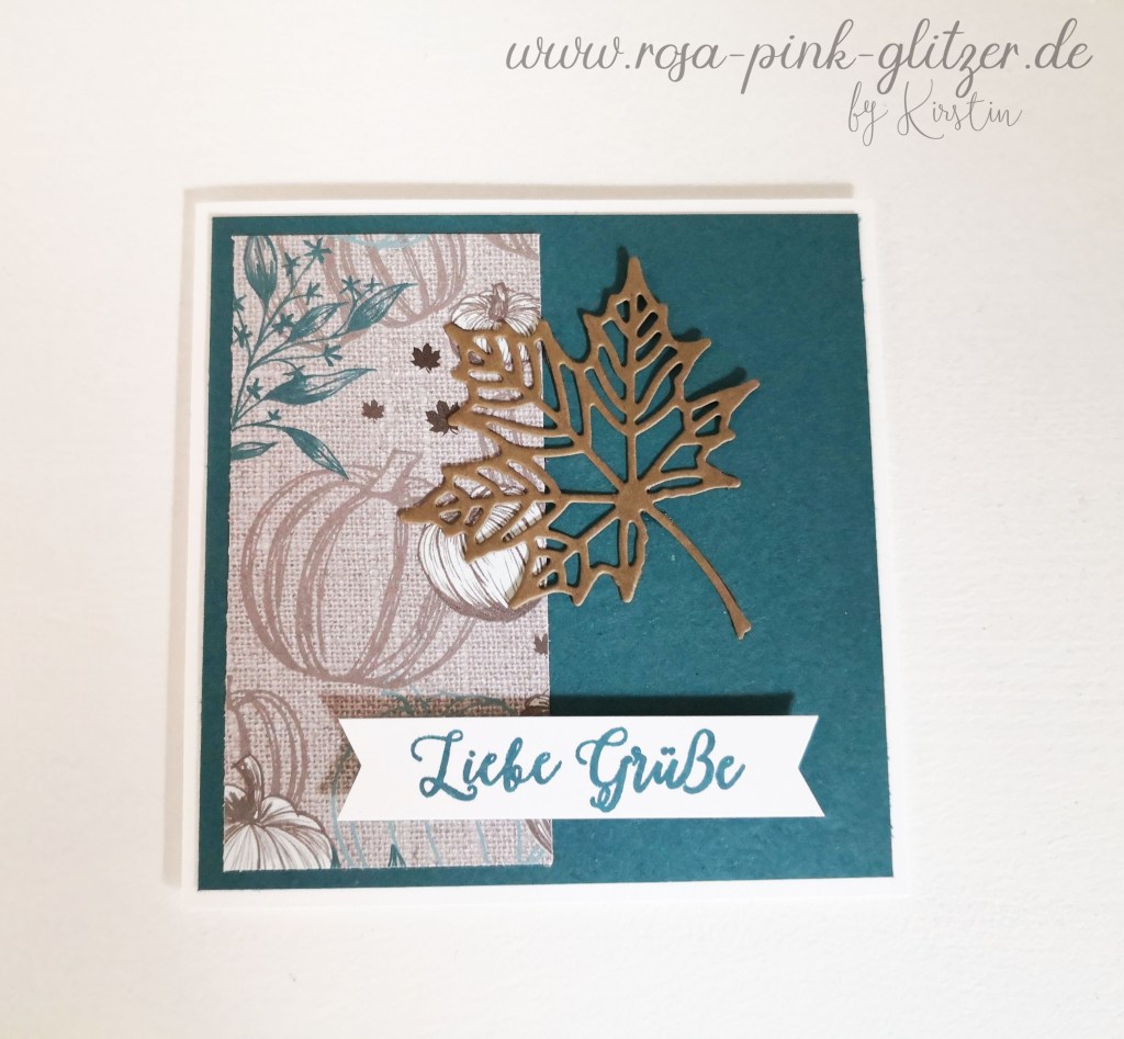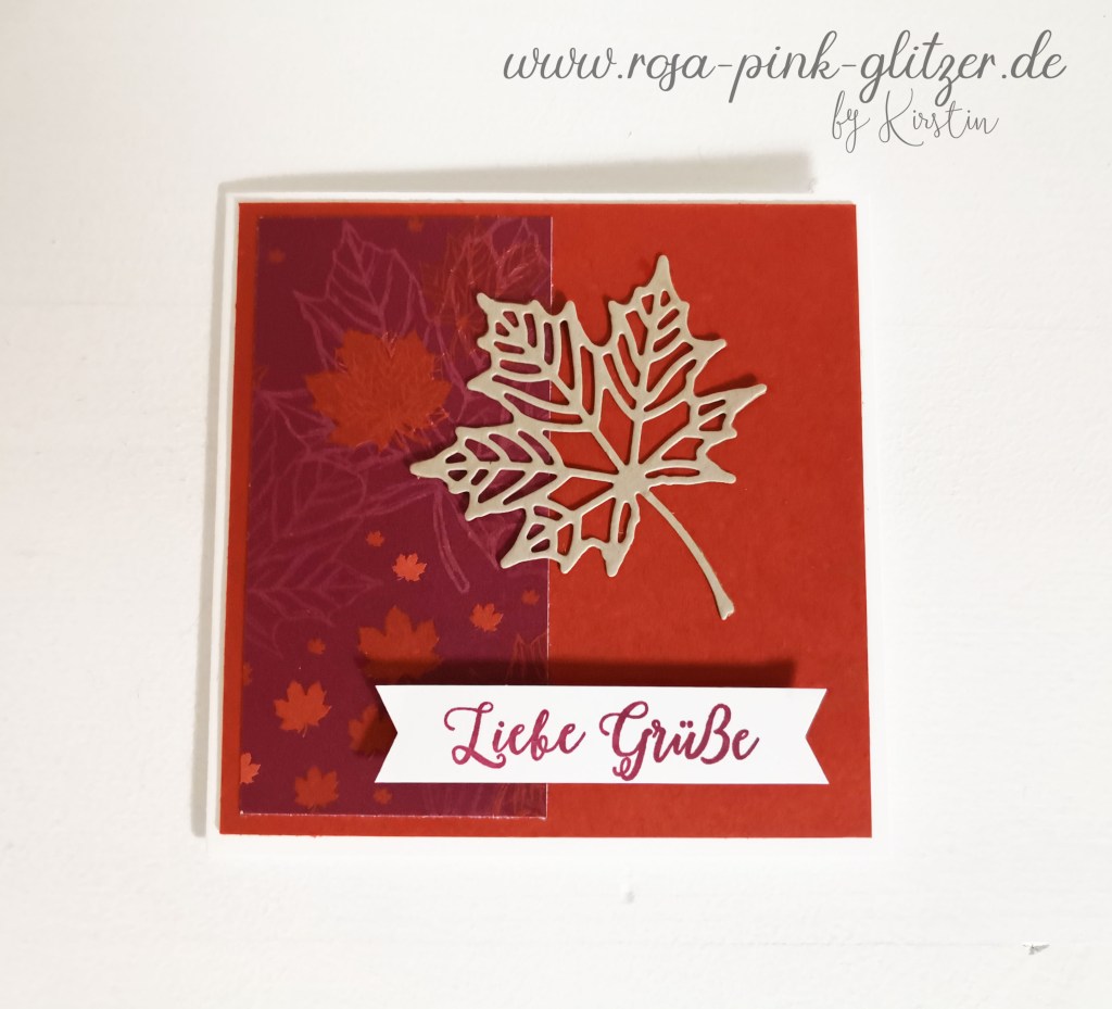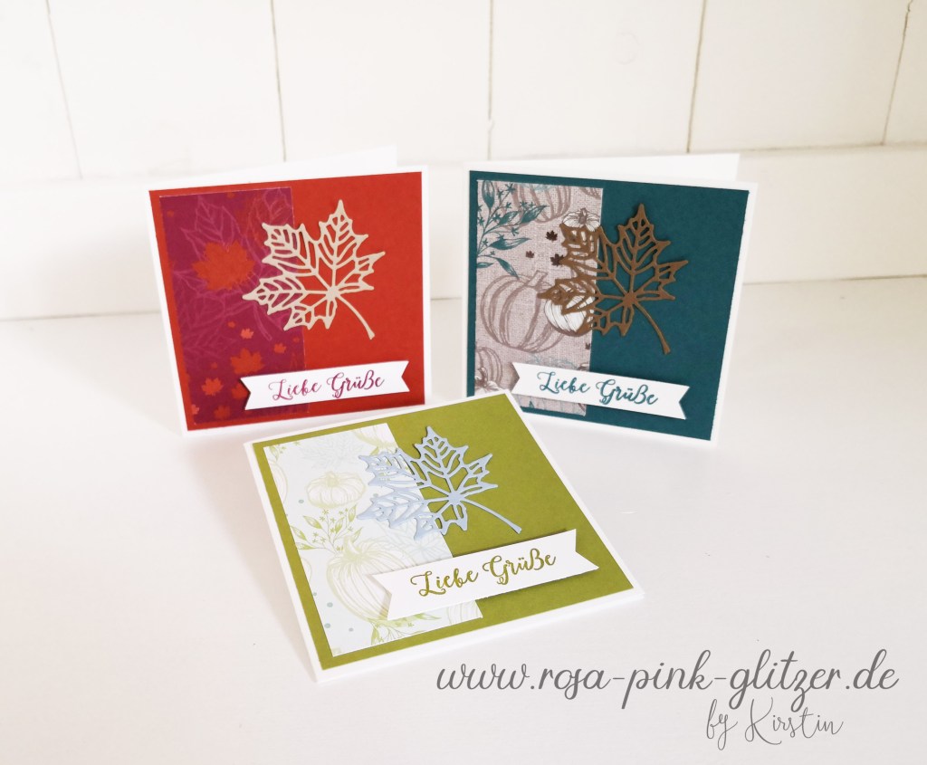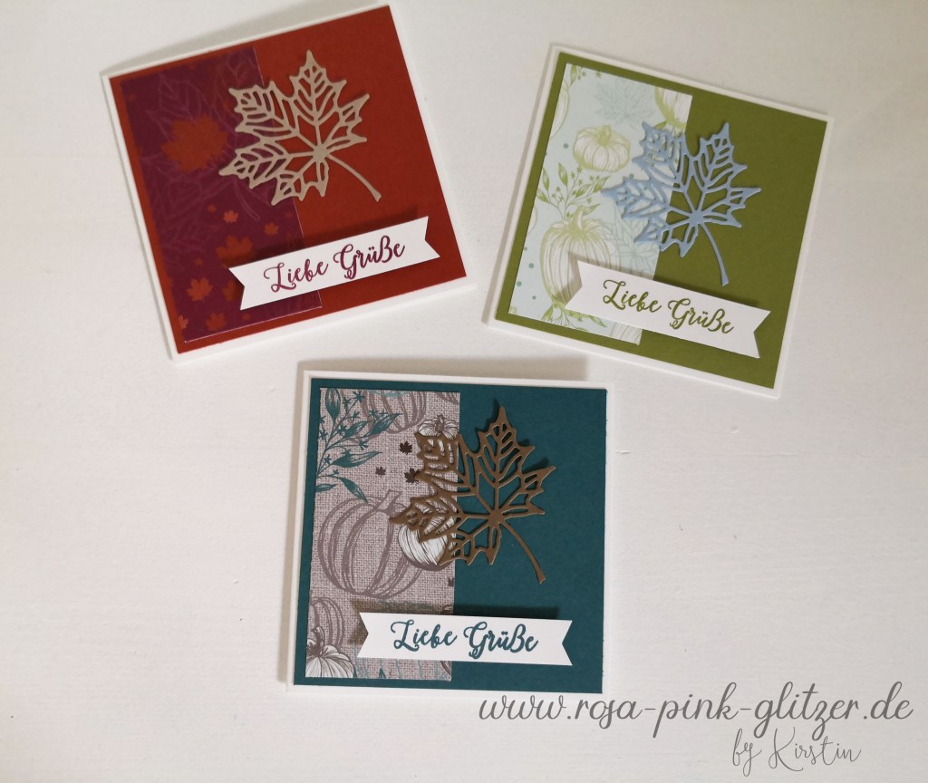 Ich habe herbstliche Minikärtchen für Euch. Das Herbst-DSP im neuen Stampin up Katalog ist wirklich zauberhaft. Dazu ein ausgestanztes Blättchen – fertig ist ein lieber Gruß.