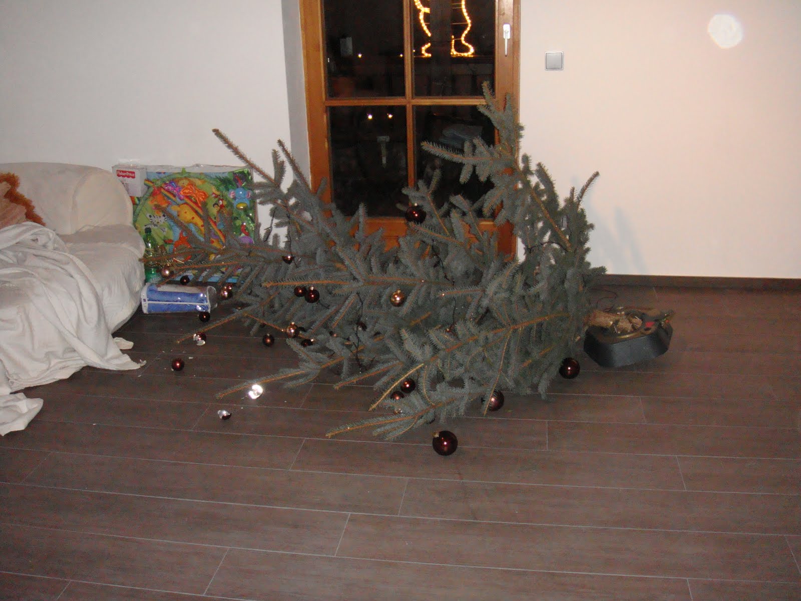 Was ich Euch auch nicht vorenthalten kann ist unsere Interpretation von Knut. Wie wir alle aus der Werbung des schwedischen Möbelhauses kennen ist Knut das Fest, bei dem die Weihnachtsbäume fliegen lernen. Tja, unserer wollte dieses Jahr auch mitmachen und so flog er in voller Montur, heißt mit Kugeln und allem drum und dran, einfach mal um: