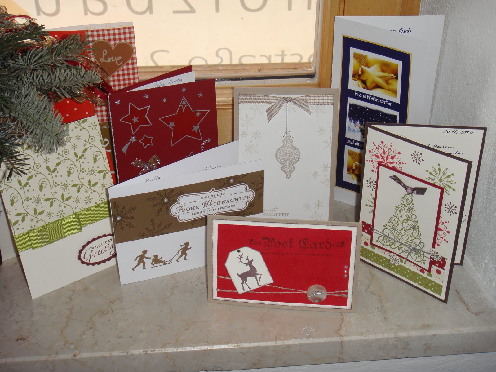 Eine schöner als die andere, oder? Und die kommen von ganz lieben Menschen. Ganz hinten links von Tamara (ok, die war nicht selbstgebastelt aber superlieb geschrieben), dann von links nach rechts von ela, Maria (die rote), Tina, Heike, Renate, Annemarie und ganz vorn von Marion.