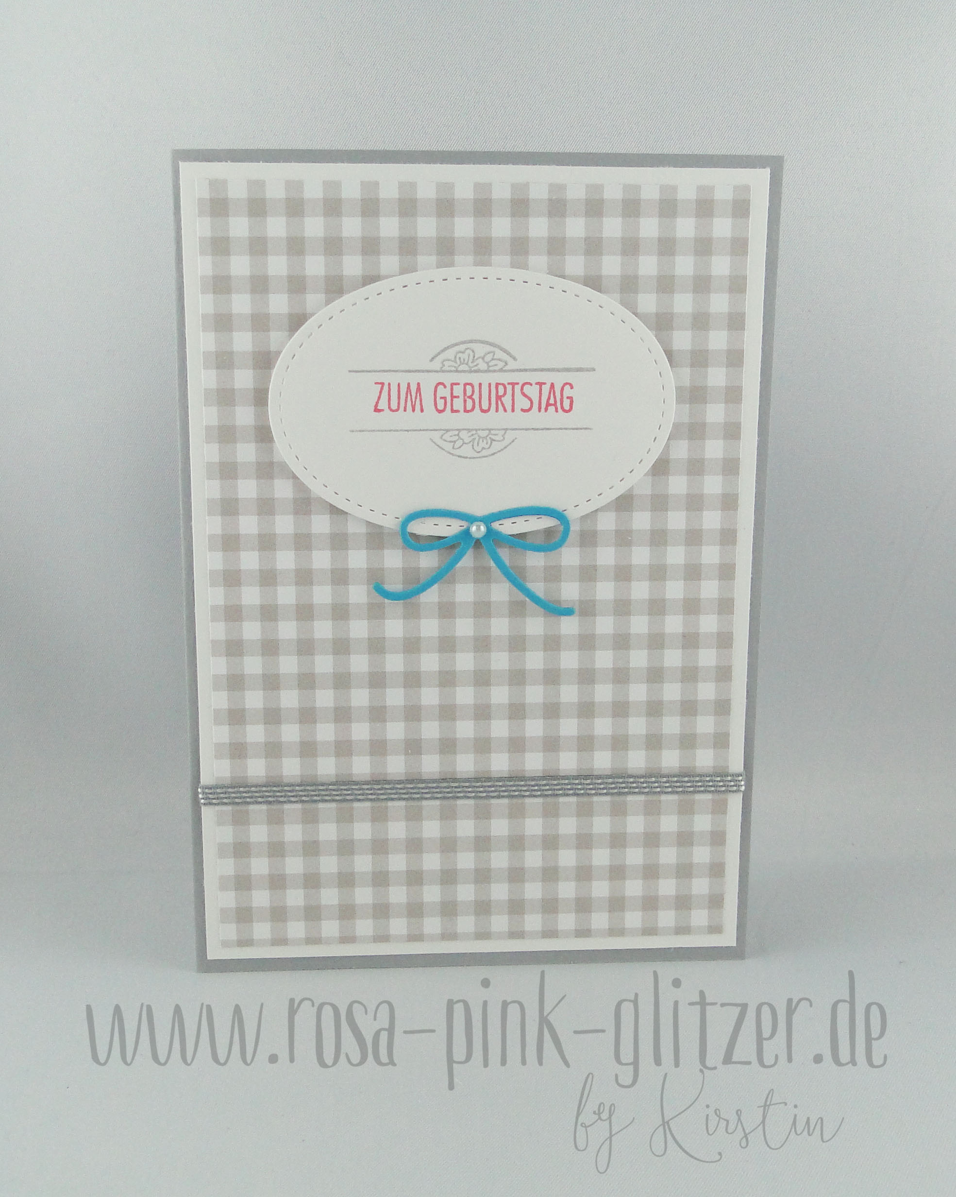 Puh, das war nicht so einfach für mich. Ich LIEBE jede Farbe für sich – aber in Kombi war das eine echte Herausforderung… Zum Glück gibts im Designerpapier Sukkulentengarten im aktuellen Frühjahrskatalog von Stampin up eine wunderschöne Seite mit Karos in Schiefergrau. Ich liebe dieses Muster! Dazu ein paar Stempelchen aus dem Stempelset „Angebracht“ (ebenfalls im Stampin up Frühjahrskatalog), ein kleines Schleifchen in Türkis und ein hübsches Band – fertig.