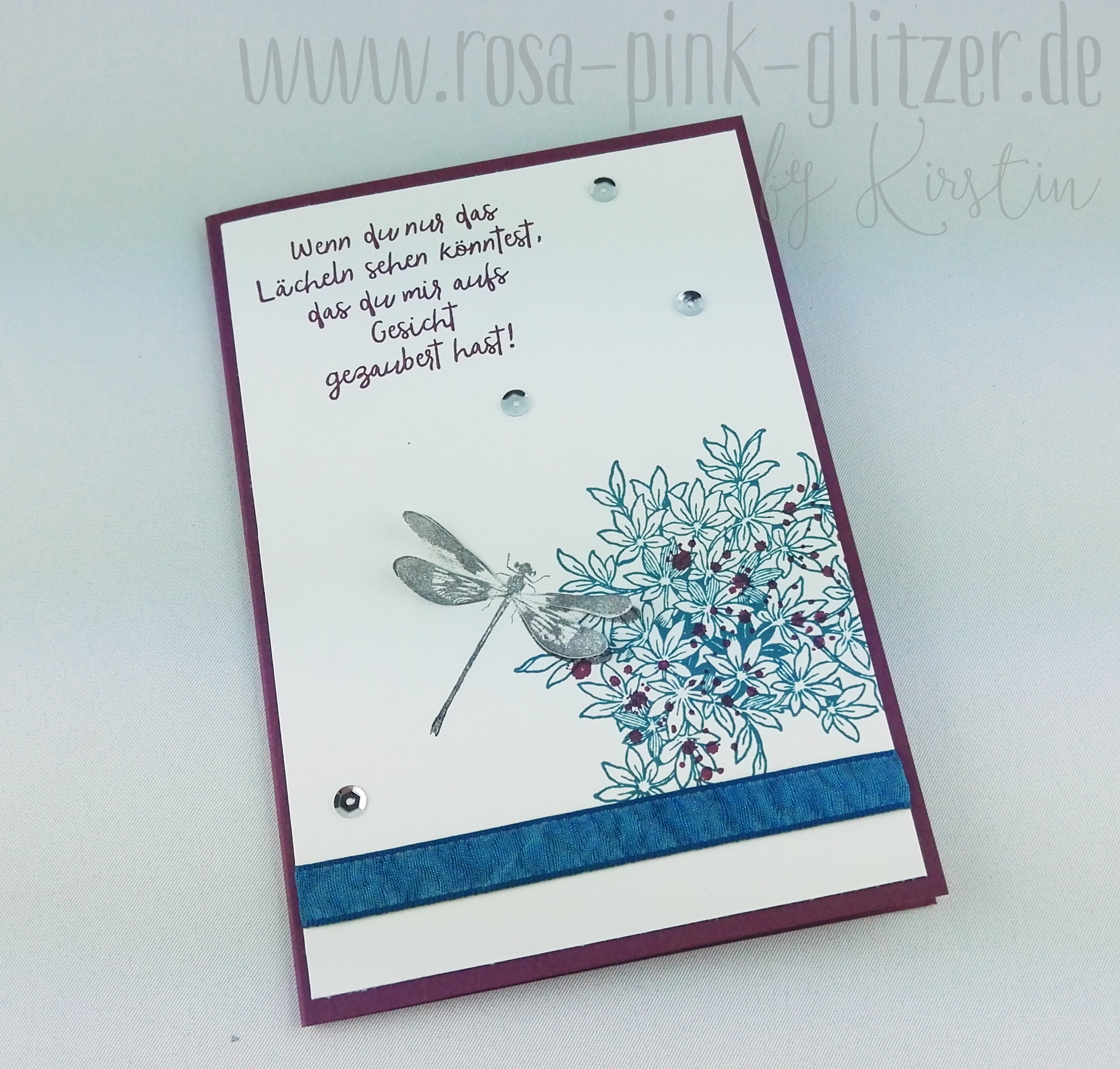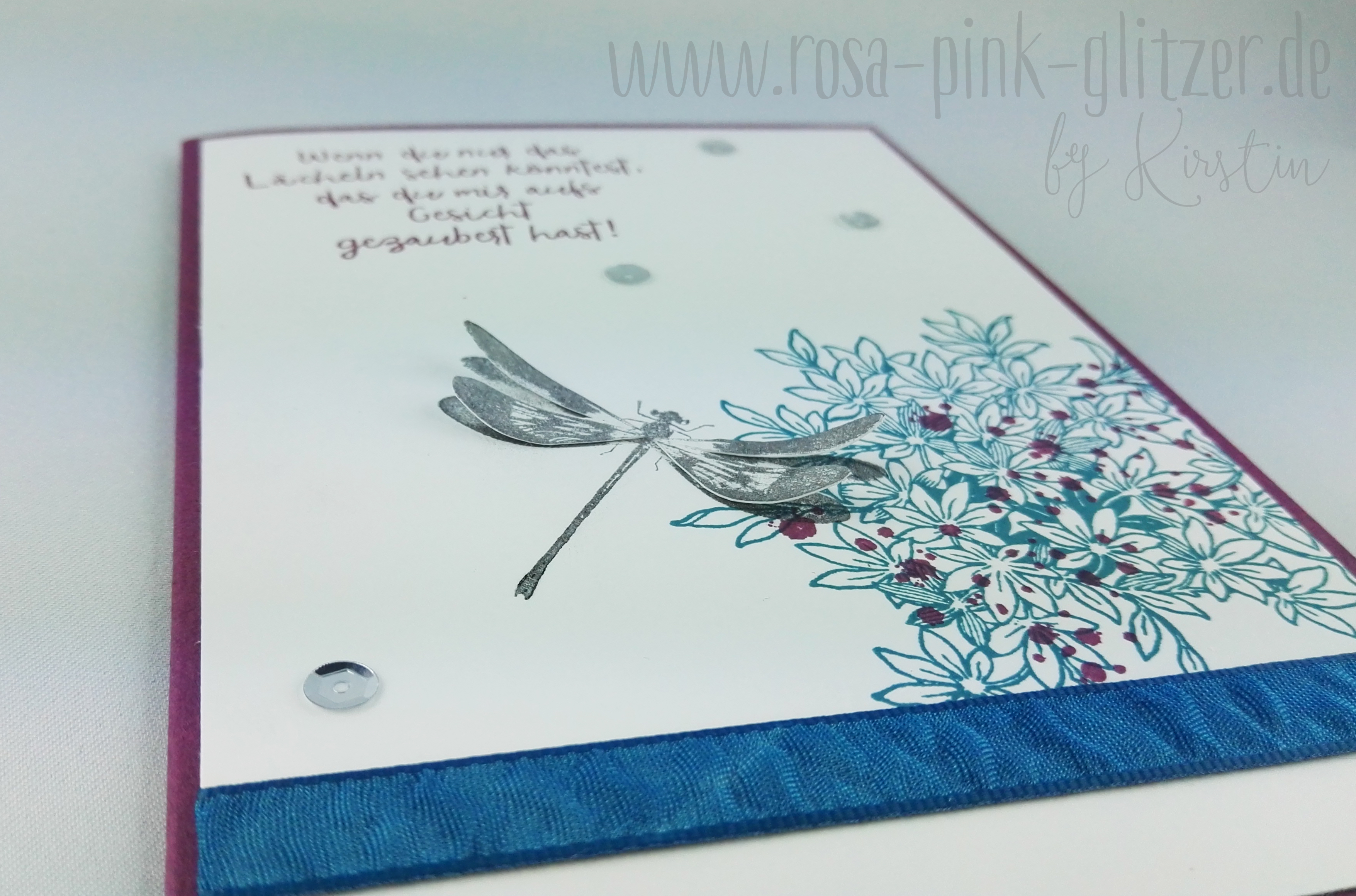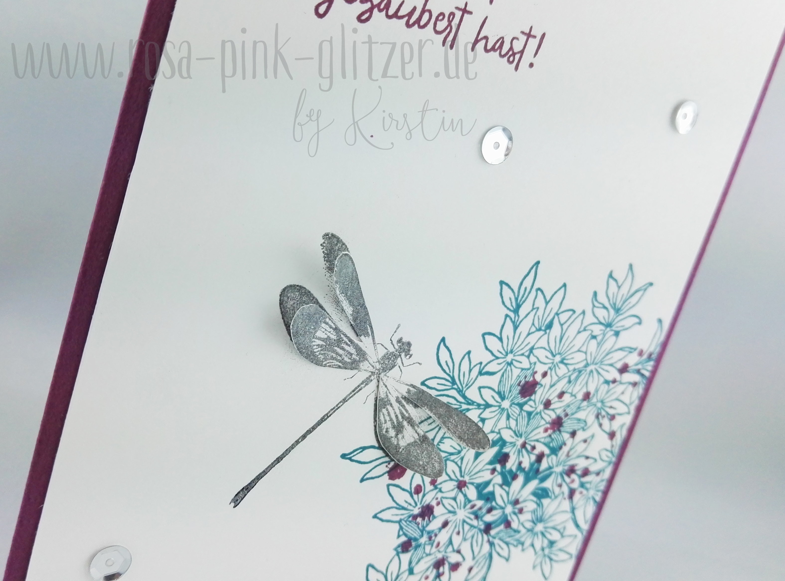 Hier seht Ihr quasi noch eine alte Libelle aus dem Stampin up Stempelset Awesomely Artistic. Ich finde die wunderhübsch, so zart und klein. Ich hab sie einmal direkt auf die Karte gestempelt und dann noch einmal separat auf Flüsterweiß, wo ich nur die Flügel ausgeschnitten habe und an der Spitze nochmal auf die Karte geklebt hab.