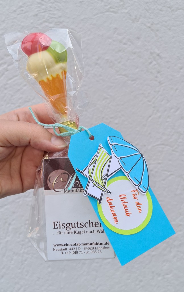 Aber damit auch etwas gestempelt ist, habe ich die Rückseite ebenfalls gestaltet. Dafür hab ich zum Stempelset Beach Happy gegriffen. Das Schildchen ist gedruckt, so kleine Buchstaben hatte ich nicht im Stempelfundus.