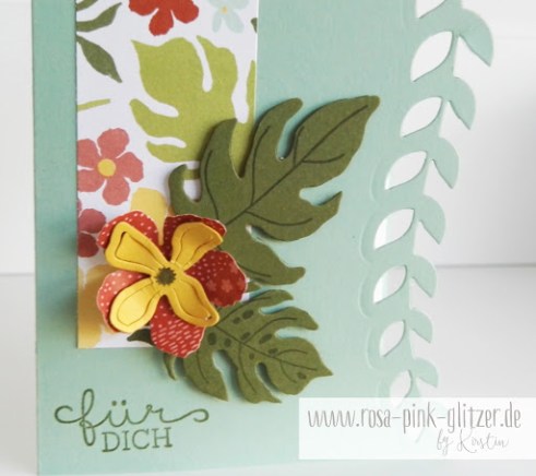 Den Hintergrund hab ich mit dem Blättermeer-Prägefolder aus dem aktuellen Stampin up Katalog geprägt. Könnte ja sonst zu leer aussehen…