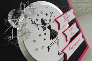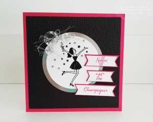 Oh wäre das schön, wenn ich einen Stempel hätte, in dem Champagner vorkommt. Moment, da war doch was! Jaaa, im neuen Frühjahrskatalog! Gut, normalerweise wäre das jetzt wohl genau das Set gewesen, das ich nicht zuhause habe. Aber nein, genau das hatte ich! Juchu! Gut, der Rest ergab sich dann und ich war in einem wahren Bastelrausch und war am Ende so begeistert von der Karte – es fühlte sich an, als hätte ich den Champagner getrunken. Eine ganze Flasche davon. Aber nein, ich schwöre, ich hatte nur schnödes Wasser am Tisch stehen. Nichtmal ein Gläschen Prosecco, das sonst ab und zu mitbasteln darf.