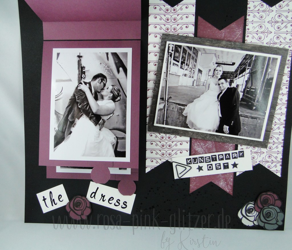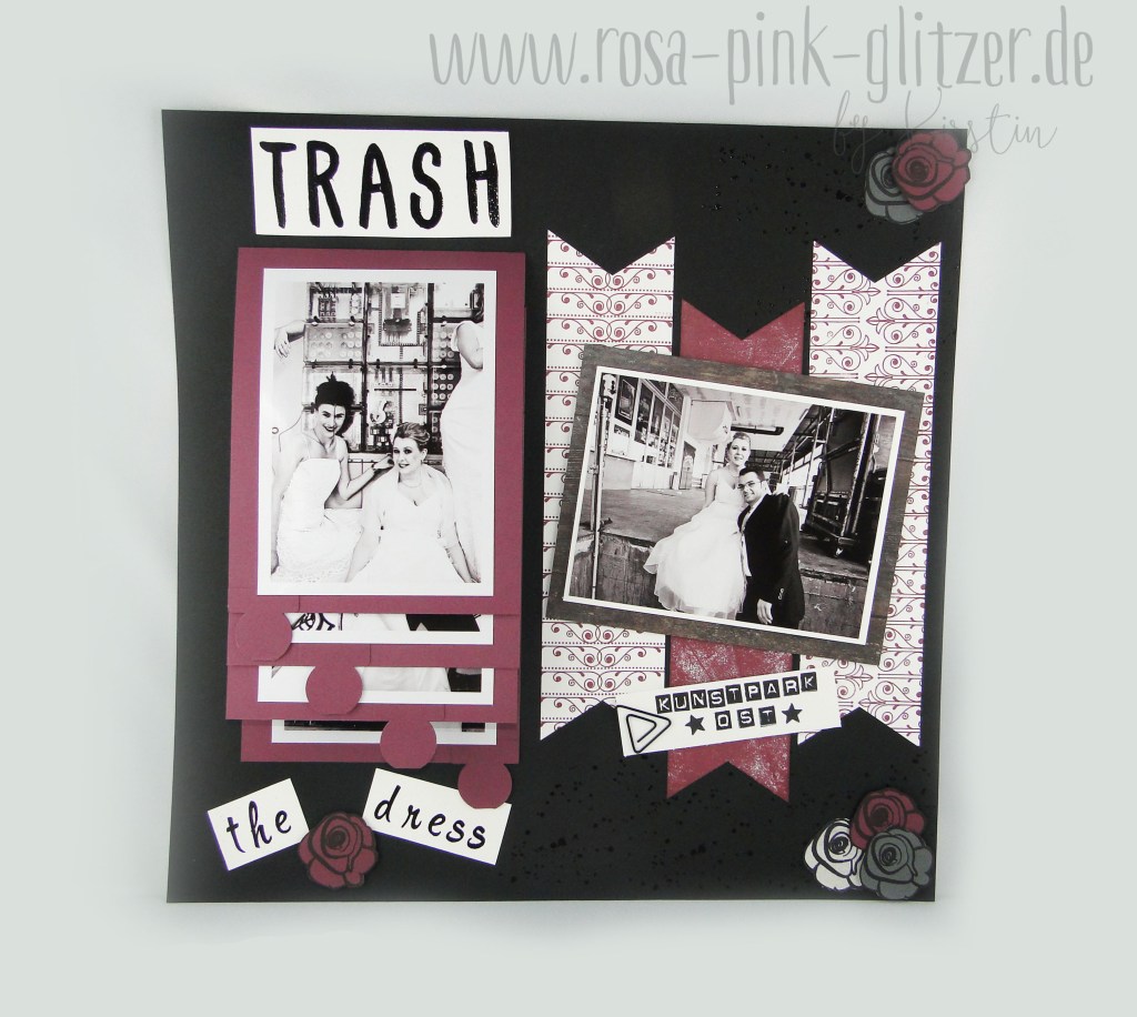Die Rosen sind ebenfalls Teil des Segensfeste-Stempelset. Die „Flecken“ im Hintergrund schimmern übrigens so, weil ich sie in schwarz embosst habe. Ich finde, das verleiht dem ganzen ein wenig Glamour und passt super zum Trash-the-Dress-Thema.