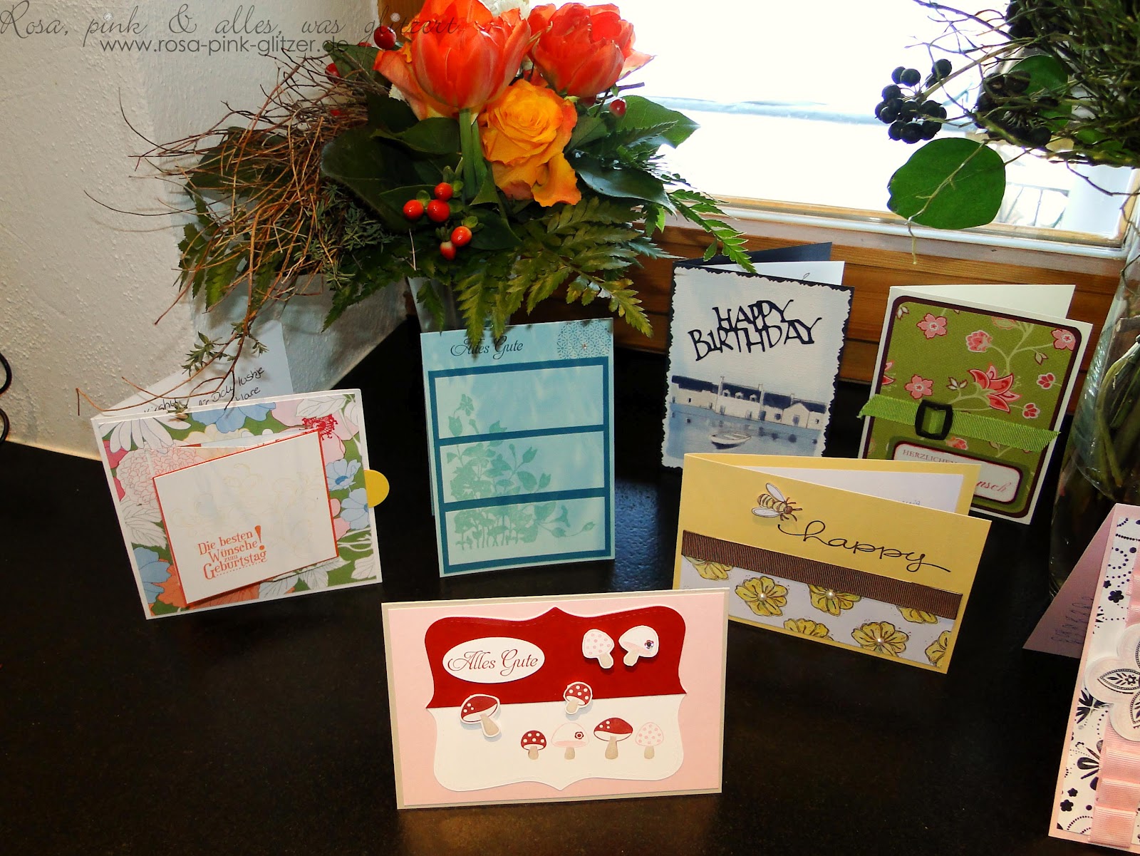Zuerst aber noch ein ganz dickes Dankeschön für die lieben Glückwünsche und wunderschönen Karten. Sieht das nicht toll aus? Ich hab mich jetzt mal auf die selbstgebastelten beschränkt, weil die doch immer am interessantesten sind. 😉