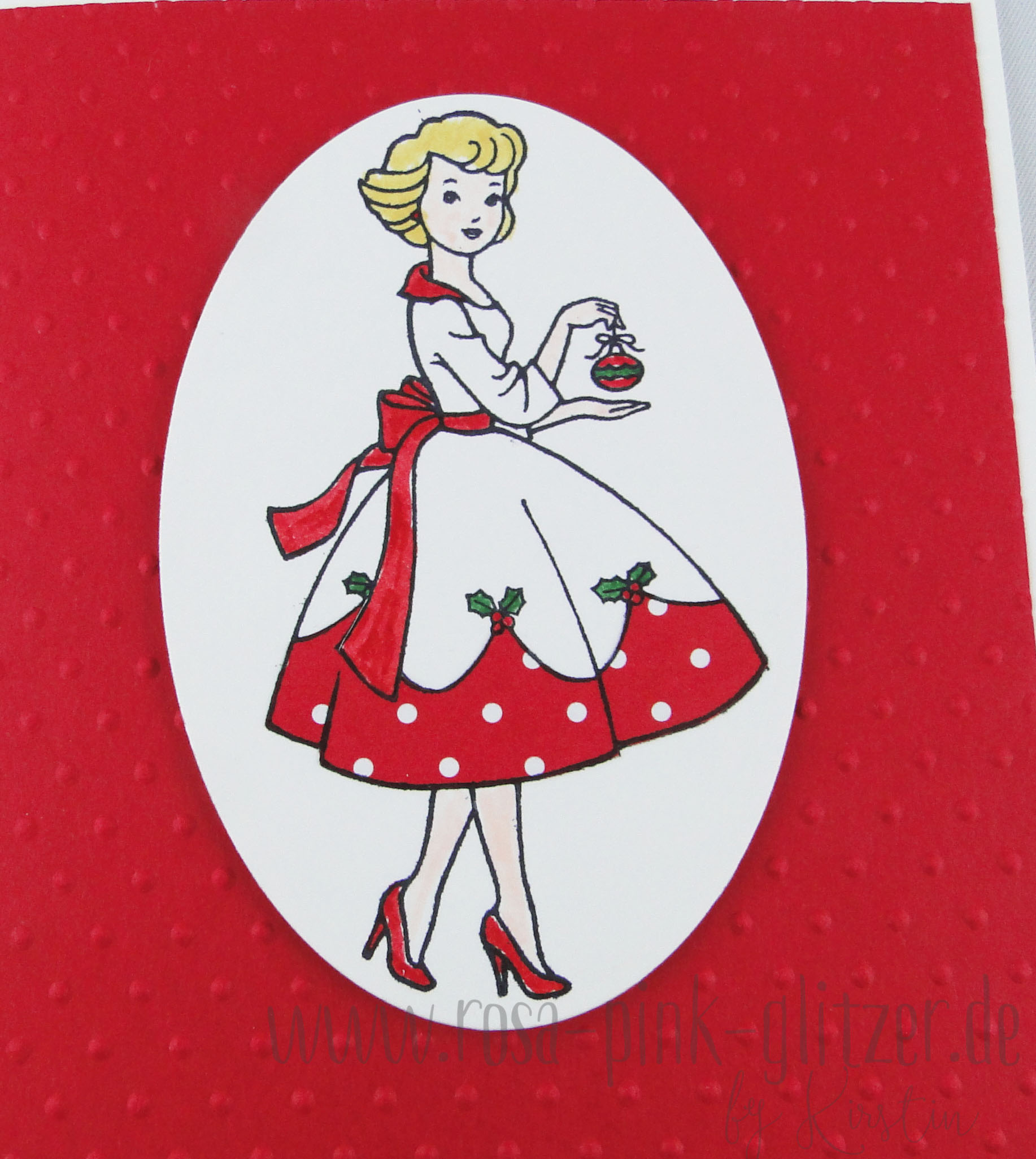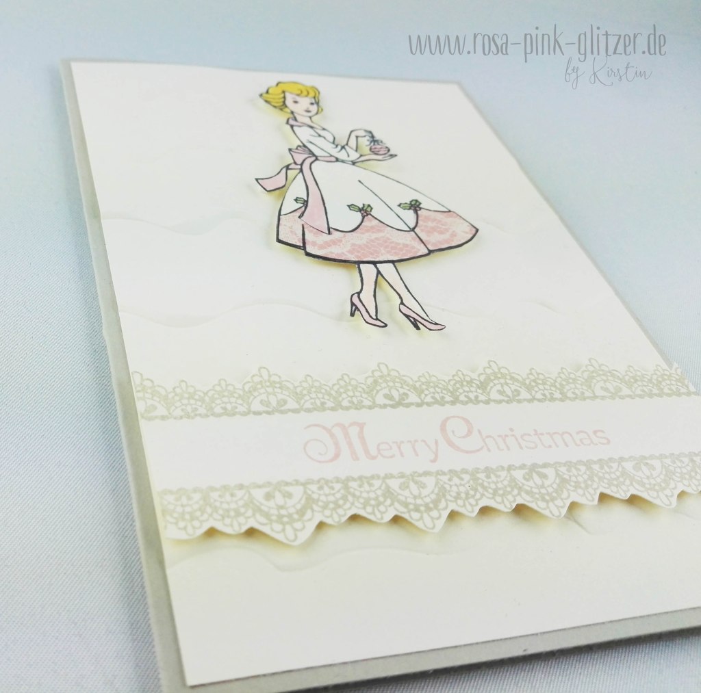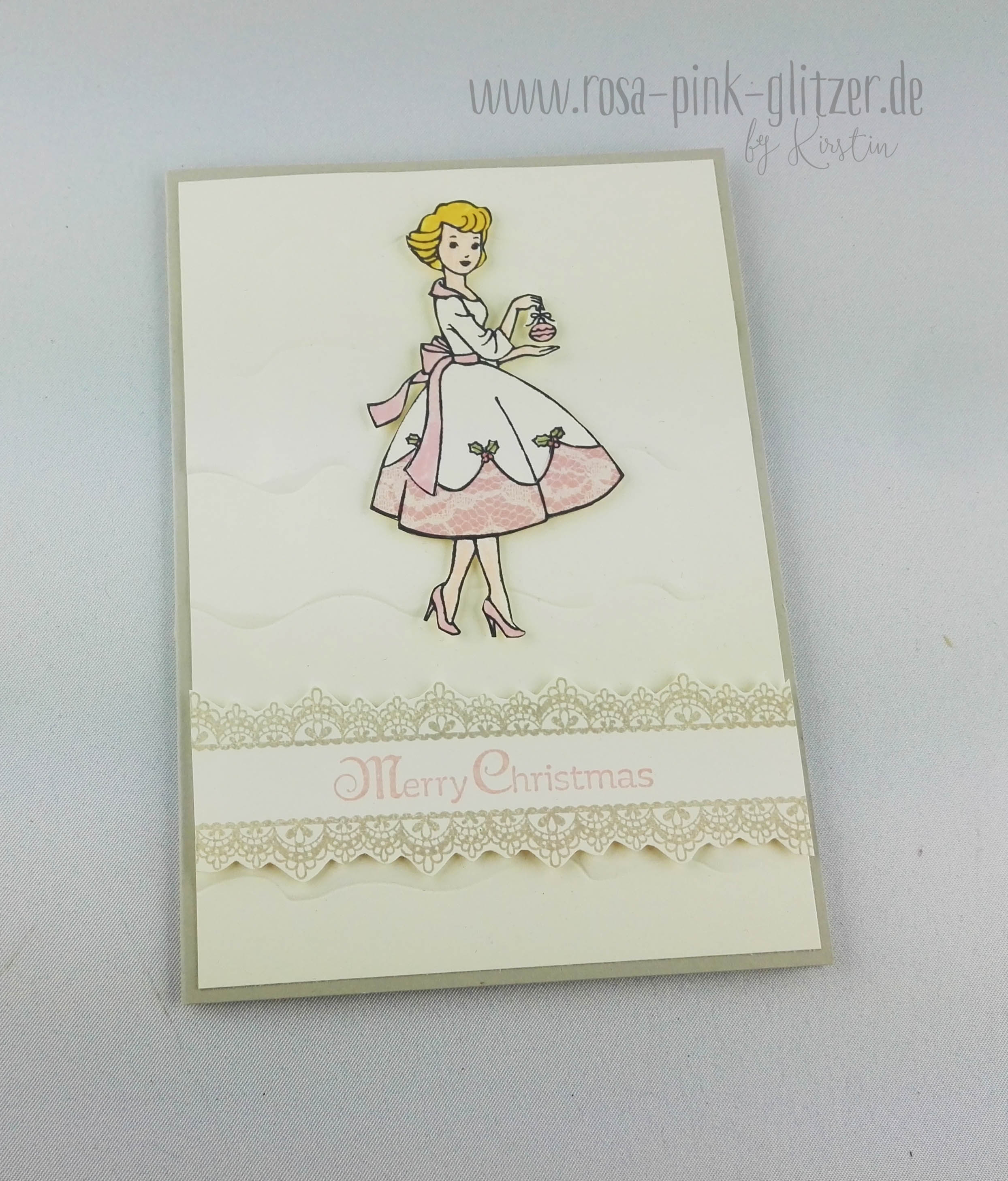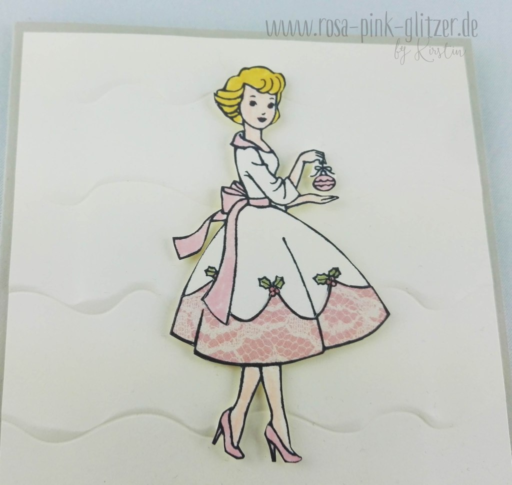 Der wunderhübsche Dame mit der Christbaumkugel hab ich ein Kleidchen mit rosa Spitze verpasst, sie ausgeschnitten und mit Dimensionals auf geprägten Cardstock geklebt.
