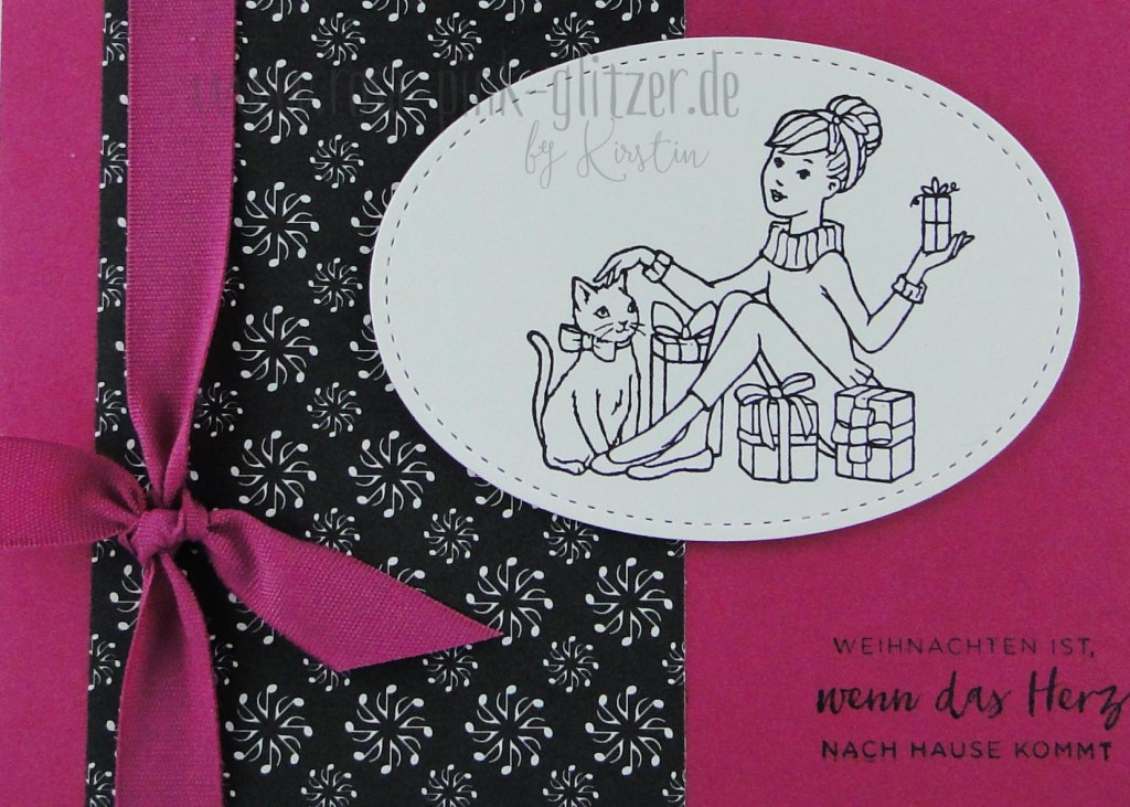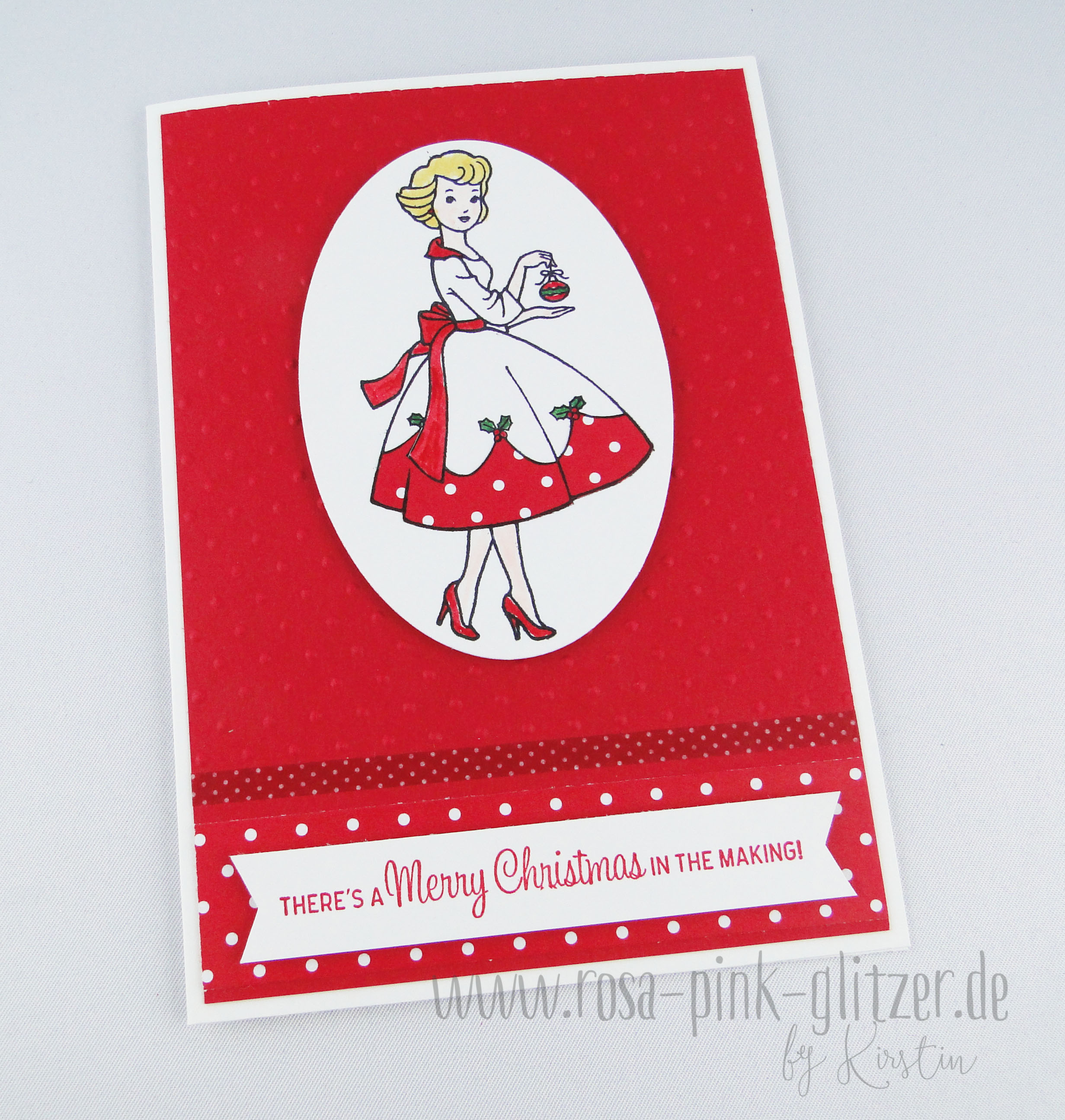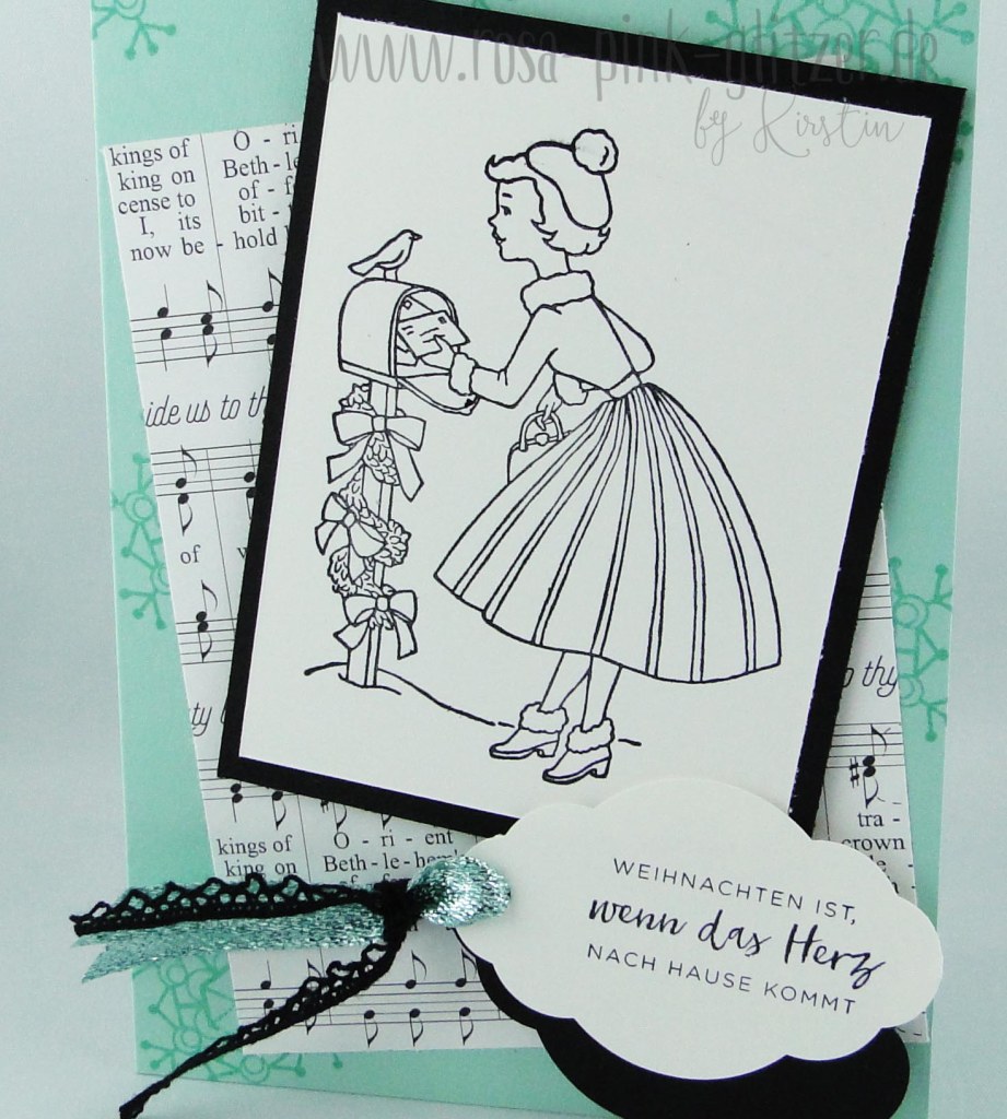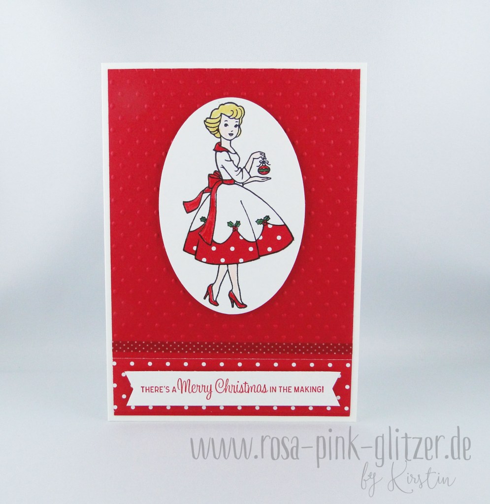Der wunderhübsche Dame mit der Christbaumkugel hab ich ein Kleidchen mit rosa Spitze verpasst, sie ausgeschnitten und mit Dimensionals auf geprägten Cardstock geklebt.