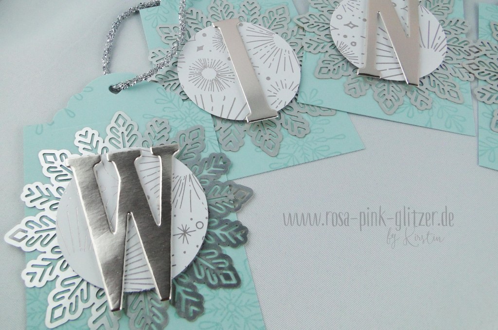 Den Hintergrund der Wimpel hab ich in Himmelblau mit den schönen Schneeflocken aus dem Stempelset „Winterwunder“ von Stampin up gestempelt. Die Glitzergirlande, auf die ich die Fähnchen gefädelt hab, findet Ihr übrigens auf Seite 21 im Herbst-Winter-Katalog von Stampin up.