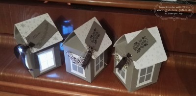Der Spruch ist in Bermudablau gestempelt und stammt ebenfalls aus dem „Es schneit“-Set. Und ein wenig Bling-Bling in Form von silbernen Glitzersternchen durfte natürlich auch nicht fehlen.