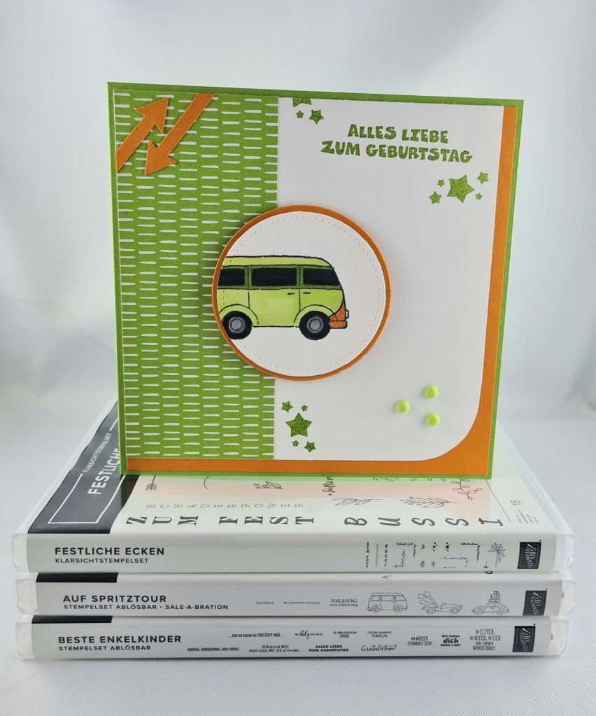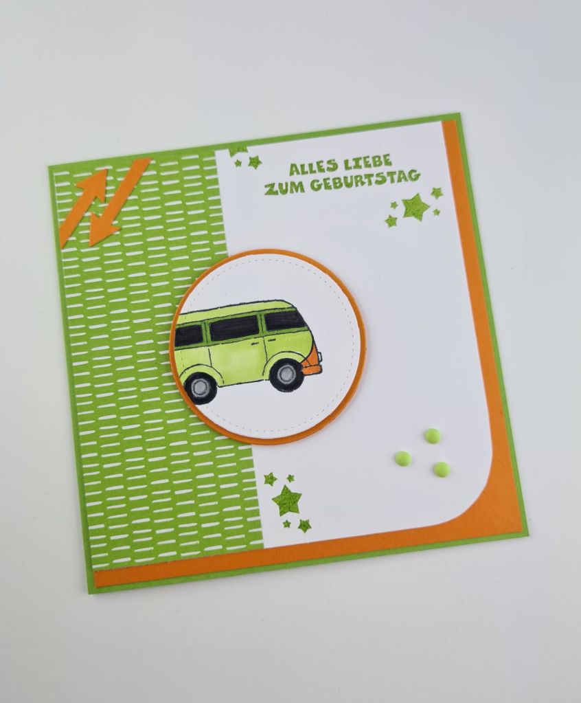 Hallo ihr Lieben, heute zeige ich Euch eine Geburtstagskarte, die ich für meine Schwester gebastelt habe. Die Karte wurde passend zum Geschenk – ein Flixbus-Gutschein – gestaltet. Jetzt muss ich wieder Werbung, unbezahlt schreiben glaub ich.