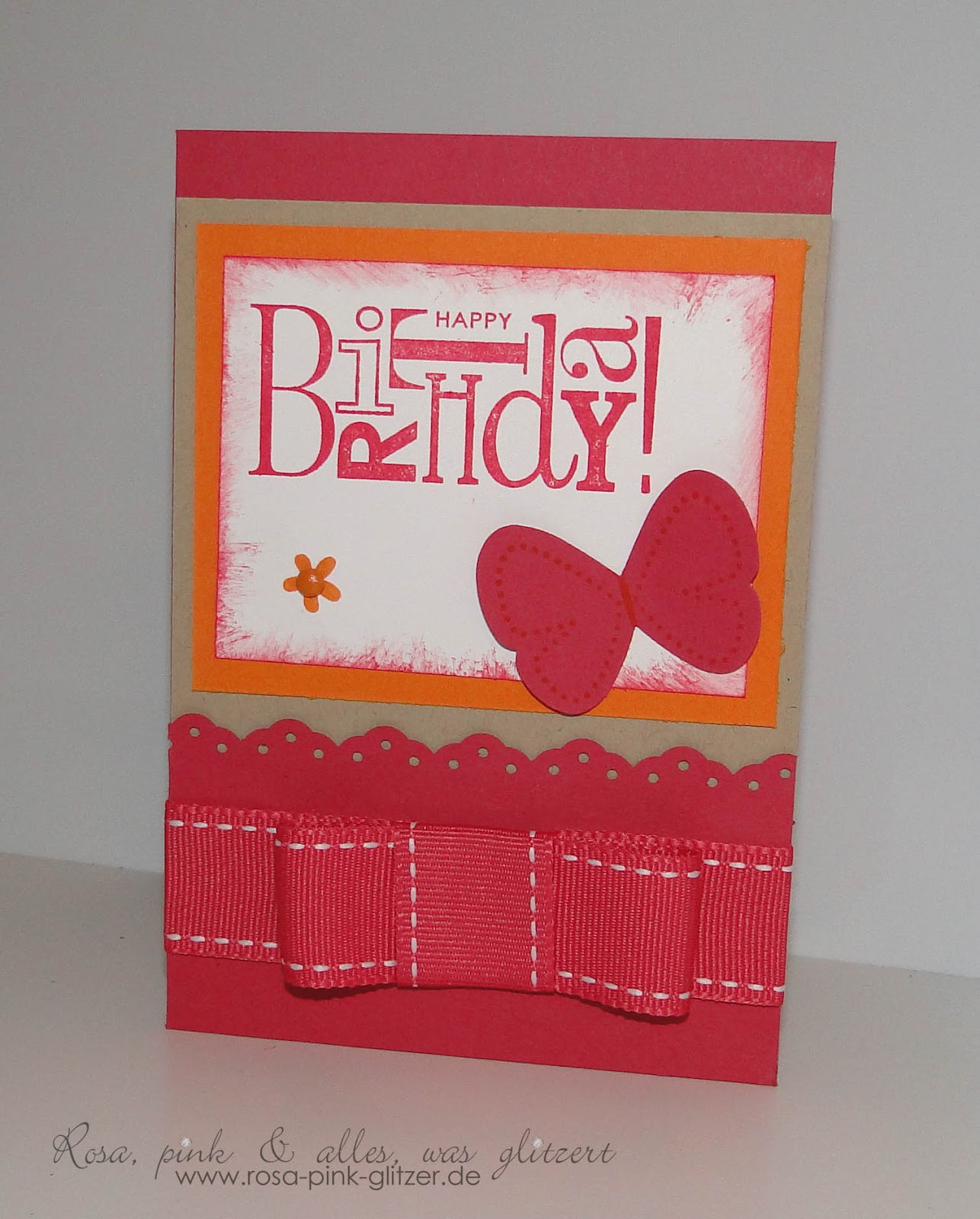 Hier ist meine Karte zur Challenge, die mich fast ein wenig traurig macht. Warum? Ich hab viele Dinge verwandt, die im neuen Katalog nicht mehr zu finden sein werden: Die Spitzenbordüren-Stanze, die Schmetterlingsstanze, das Stempelset „Flight of the Butterfly“ und auch das Stempelset „Alles Gute zum Geburtstag“. Wenn Ihr also noch etwas davon ergattern wollt, gebt mir Bescheid. So wie es aussieht, sind die Sachen noch viel schneller ausverkauft, als wir alle gedacht hätten…