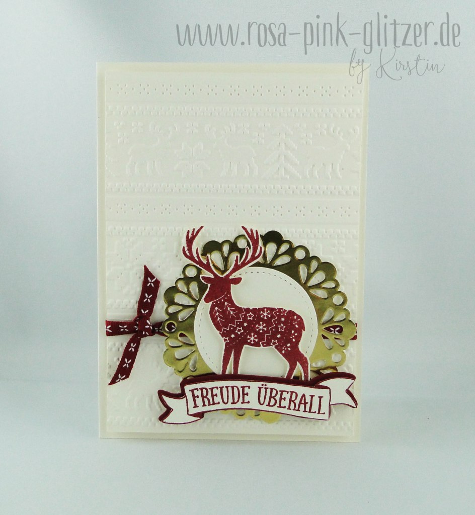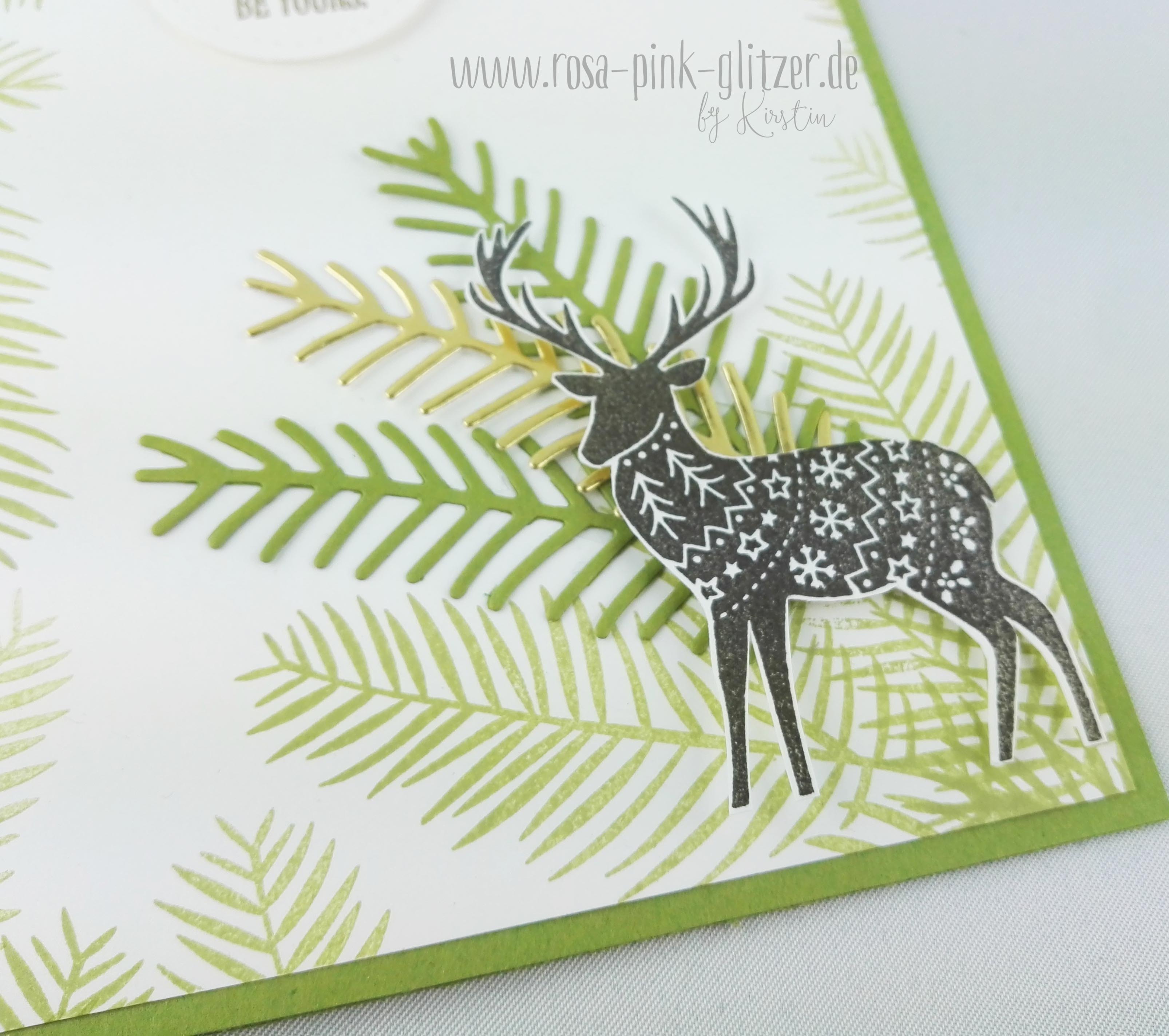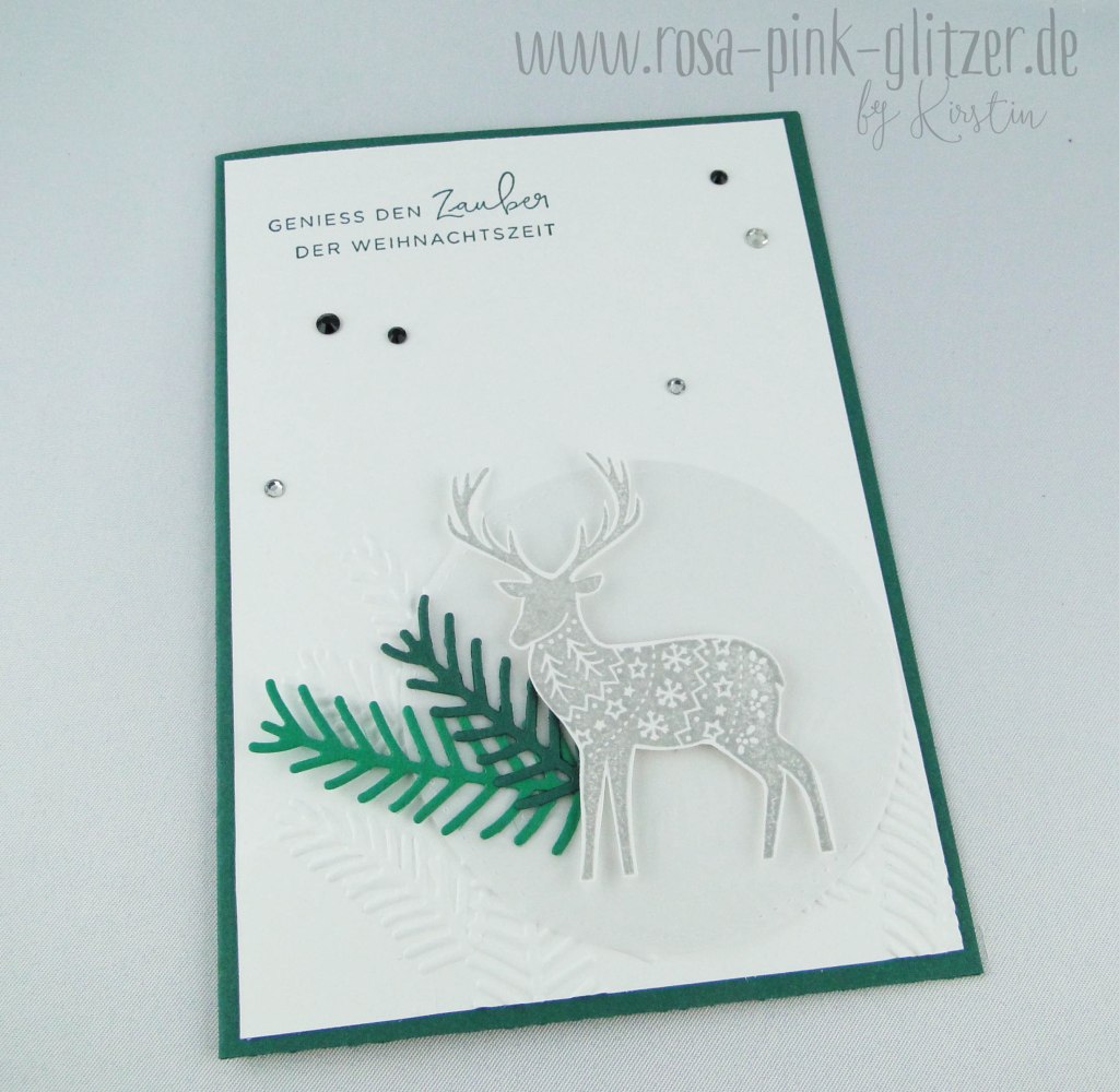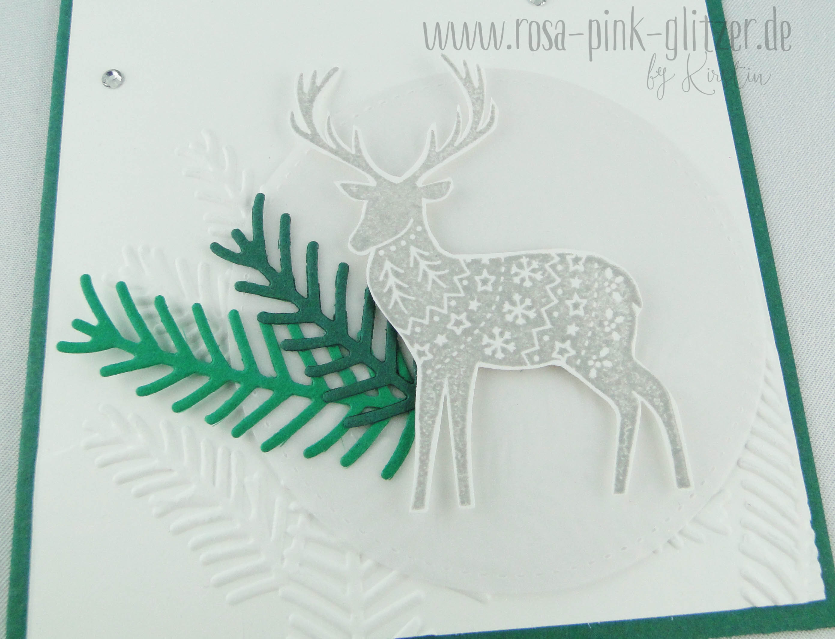 Wie Ihr seht, hab ich mich für die 3. Variante entschieden und hab mit den gestickten Framelits einen Kreis gestanzt und darauf dann den ausgeschnittenen Hirsch und die Tannenzweige geklebt.