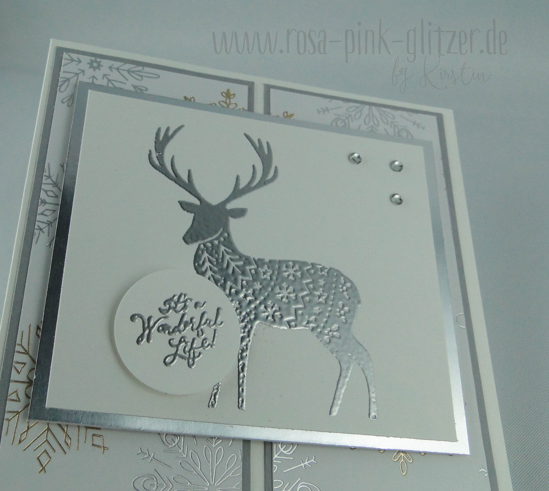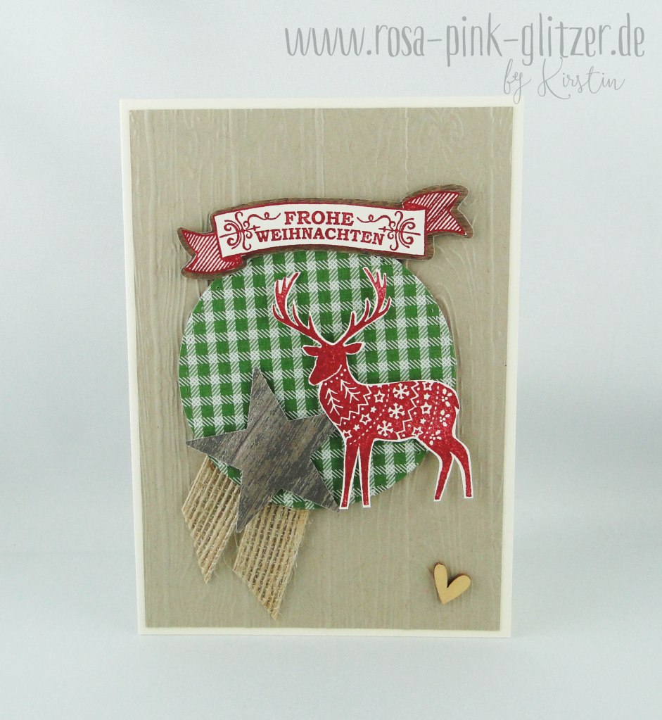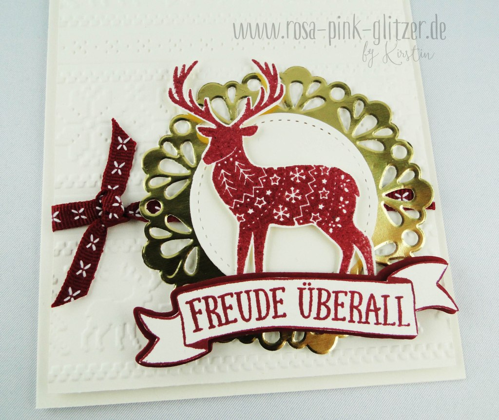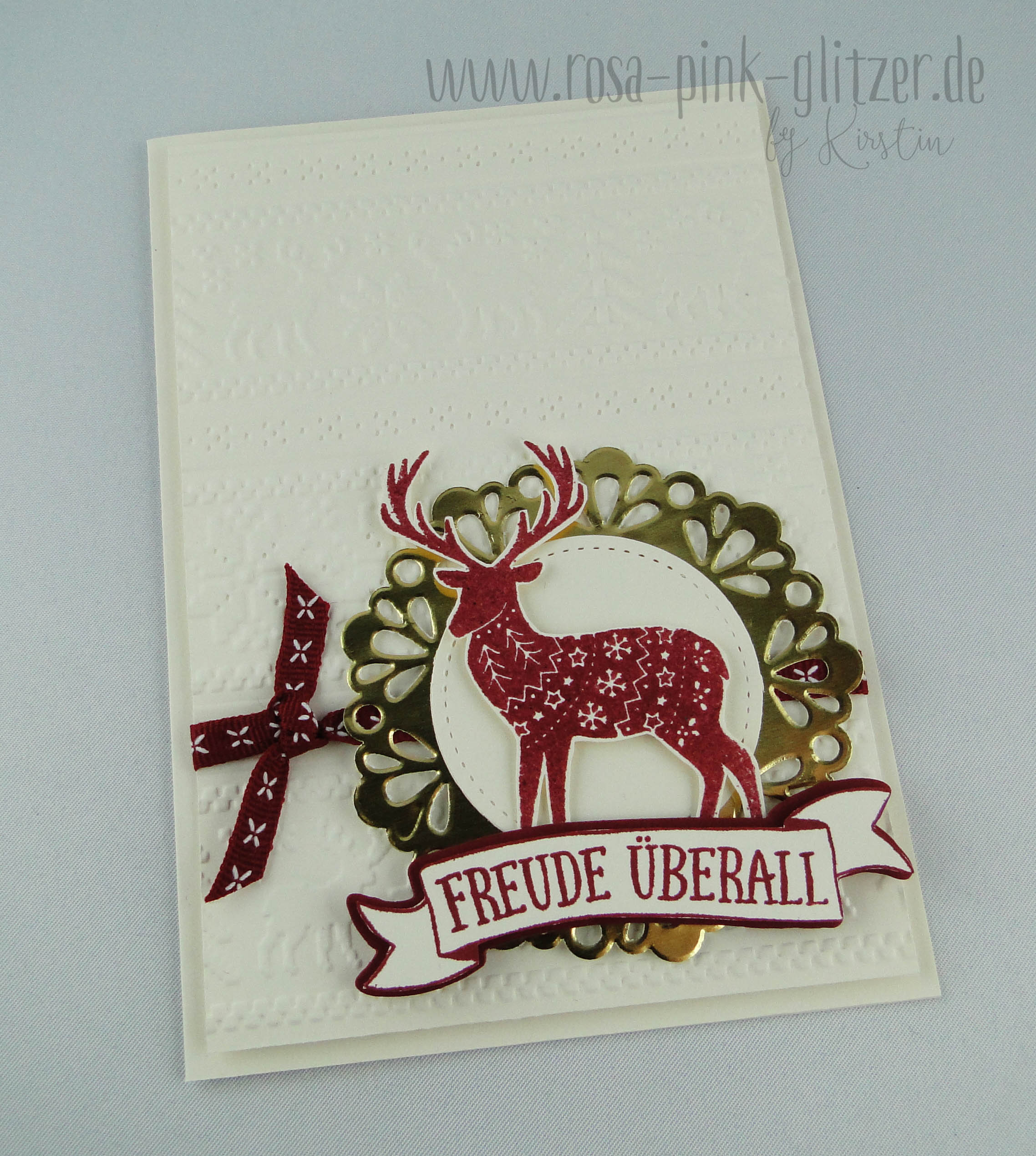 Wie Ihr seht, hab ich mich für die 3. Variante entschieden und hab mit den gestickten Framelits einen Kreis gestanzt und darauf dann den ausgeschnittenen Hirsch und die Tannenzweige geklebt.