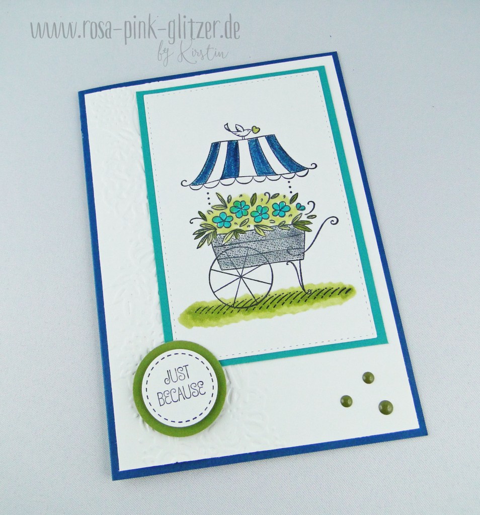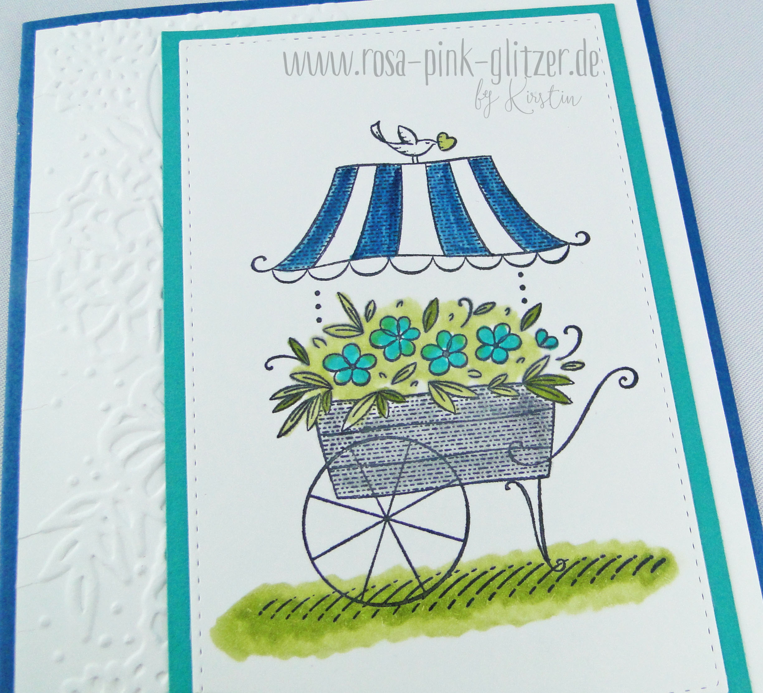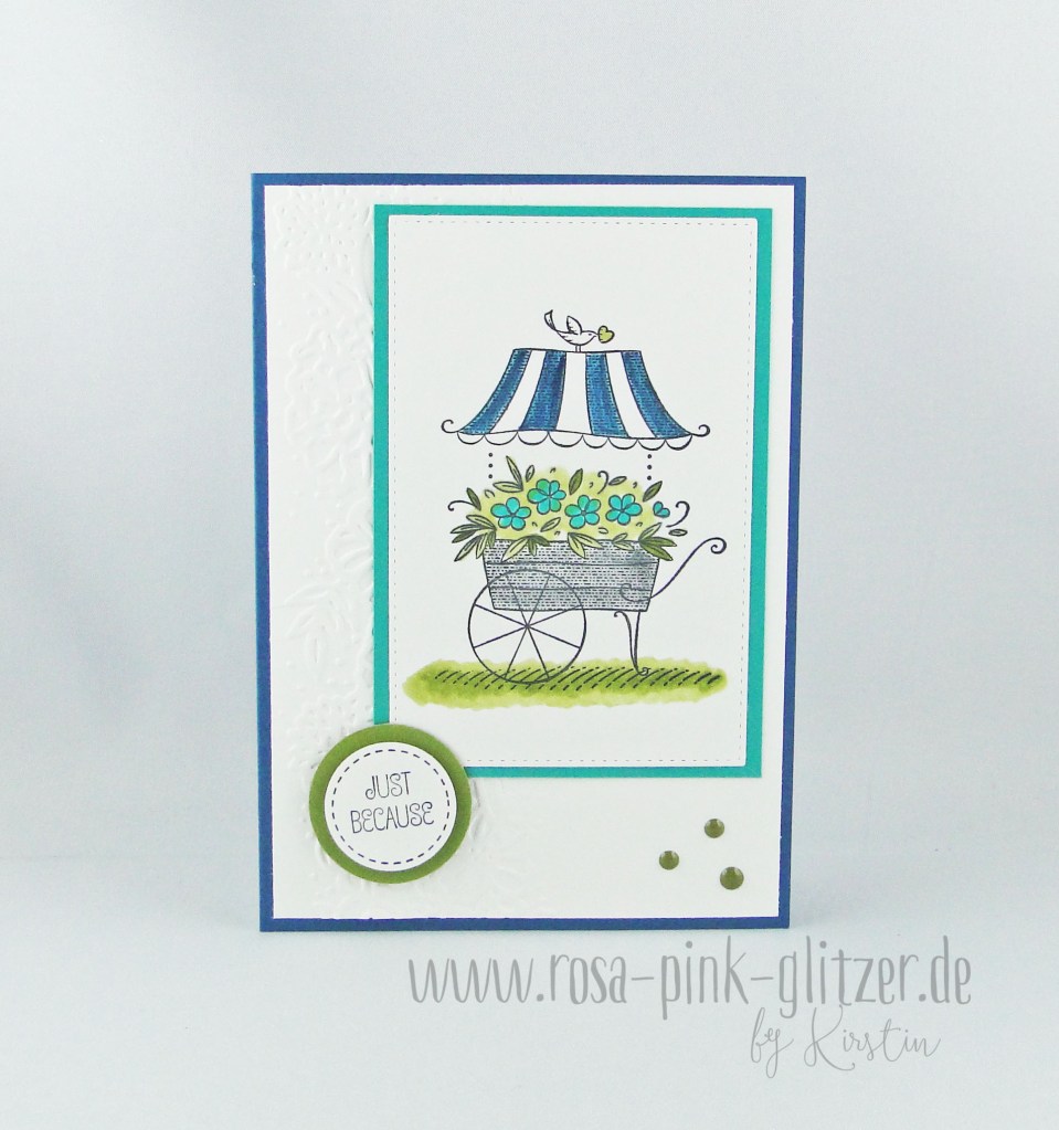 Der ein oder andere mag es vielleicht etwas kitschig finden aber ich mag eine bestimmte Art von Kitsch ja sehr gerne. Und so auch dieses Set. Auch, wenn ich es mir eigentlich mit einem rosa gestreiften Dächlein vorgestellt aber dann kam mir dieses Designerpapier in die Finger. Da passte Aquamarin doch viel besser.
