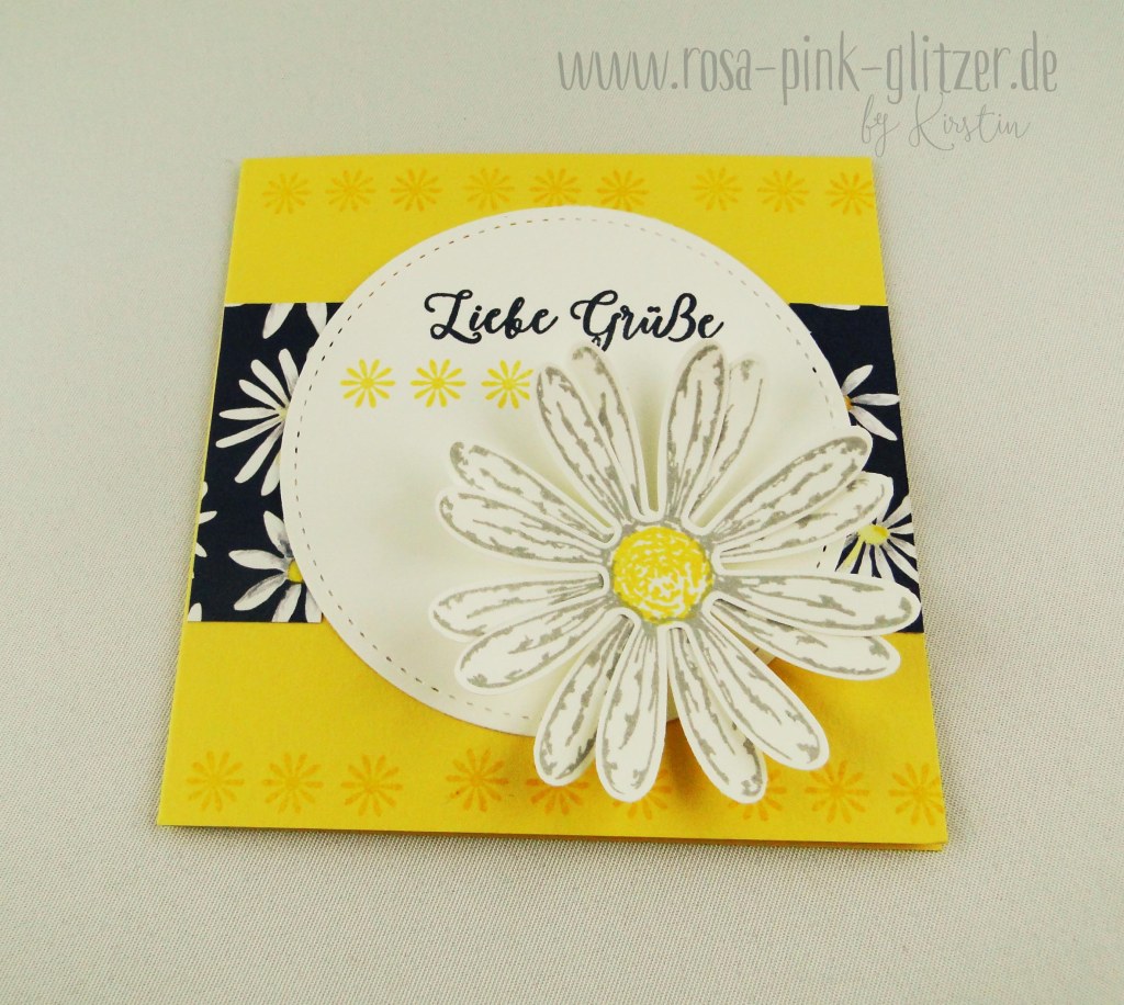 Ein Kärtchen muss natürlich immer sein. Ich hab die Ränder oben und unten Ton in Ton mit der kleinen Blüte gestempelt (leider nicht ganz gleichmäßig – ups) und aus dem wunderschönen Designerpapier einen Streifen in die Mitte geklebt. Oben drauf dann ein gestickter Kreis, der ebenfalls mit der Blume und einem kleinen Gruß (aus dem Stampin up Stempelset Jahr voller Farben) bestempelt wurde. Und natürlich durfte ein gestanztes Gänseblümchen nicht fehlen. Dafür habe ich das Gänseblümchen zweimal in Schiefergrau gestempelt und mit der passenden Stanze von Stampin up ausgestanzt. Dann leicht versetzt übereinander geklebt und die Blütenblätter mit Hilfe des Falzbeins ein wenig nach oben gebogen – fertig.