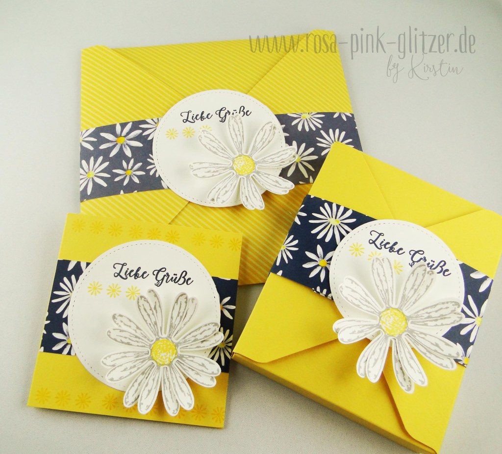 Ich zeige Euch heute das Geschenkset, das die Gewinnerin der Inkspiration-Weeks, die liebe Waltraud, bekommen hat. Ich hab dafür zum Designerpapier Gänseblümchen aus dem aktuellen Jahreskatalog von Stampin up gegriffen, mitsamt dem passenden Stempelset. Die Basis für die Karte und die Verpackungen ist Osterglocke.