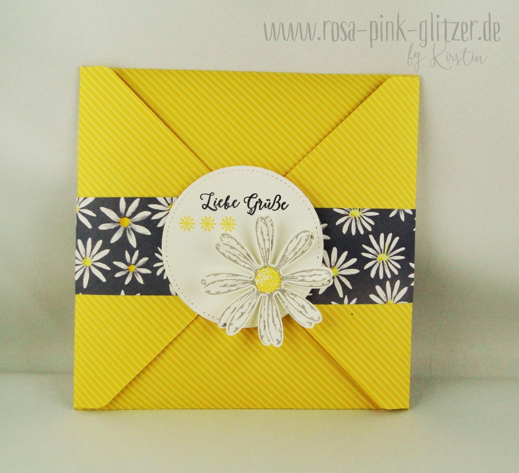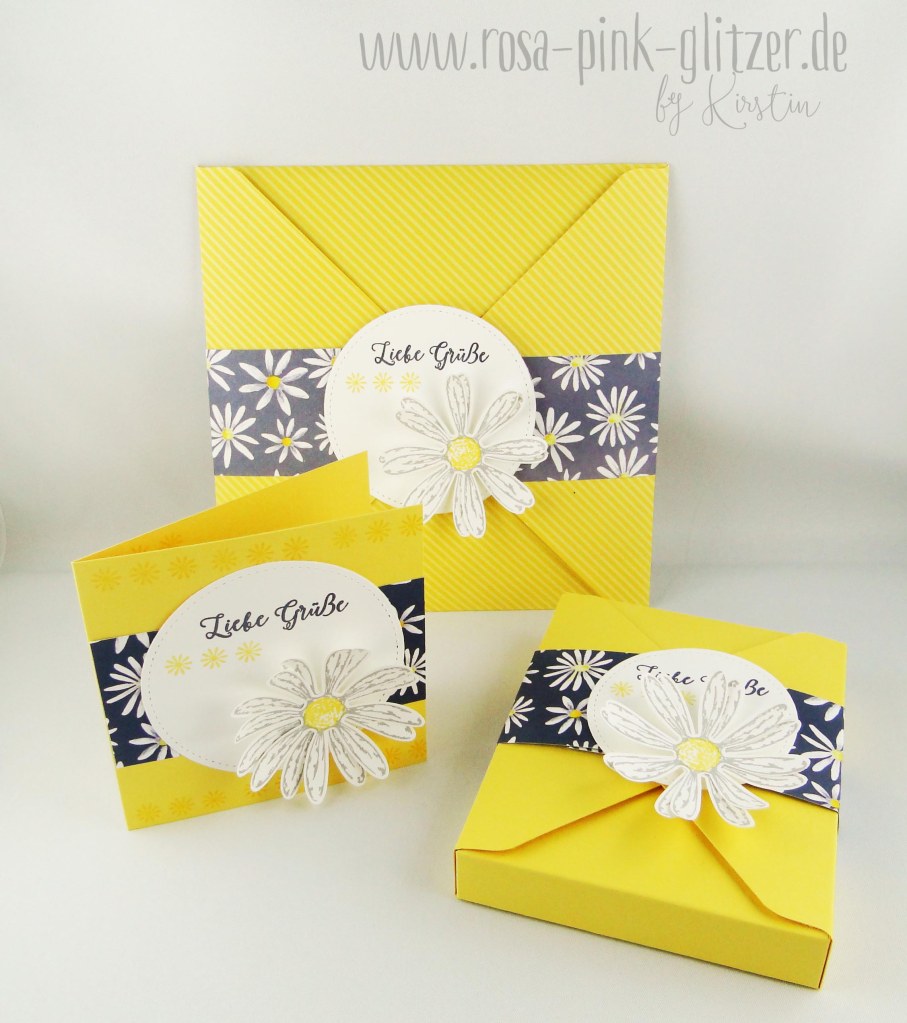 Ich zeige Euch heute das Geschenkset, das die Gewinnerin der Inkspiration-Weeks, die liebe Waltraud, bekommen hat. Ich hab dafür zum Designerpapier Gänseblümchen aus dem aktuellen Jahreskatalog von Stampin up gegriffen, mitsamt dem passenden Stempelset. Die Basis für die Karte und die Verpackungen ist Osterglocke.