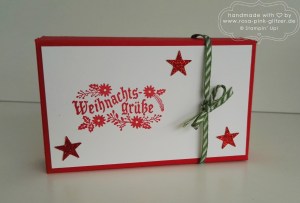Heute zeig ich Euch eine tolle Idee, wie man einen Gutschein oder auch ganz ordinäres Geld hübsch verschenken kann. Leider ohne Deko, denn eigentlich kann man diese Boxen noch wunderbar mit einer Reihe Ferrero Küsschen oder Mon Cherie befüllen. So hat man „was in der Hand“, was ich immer sehr nett finde.
