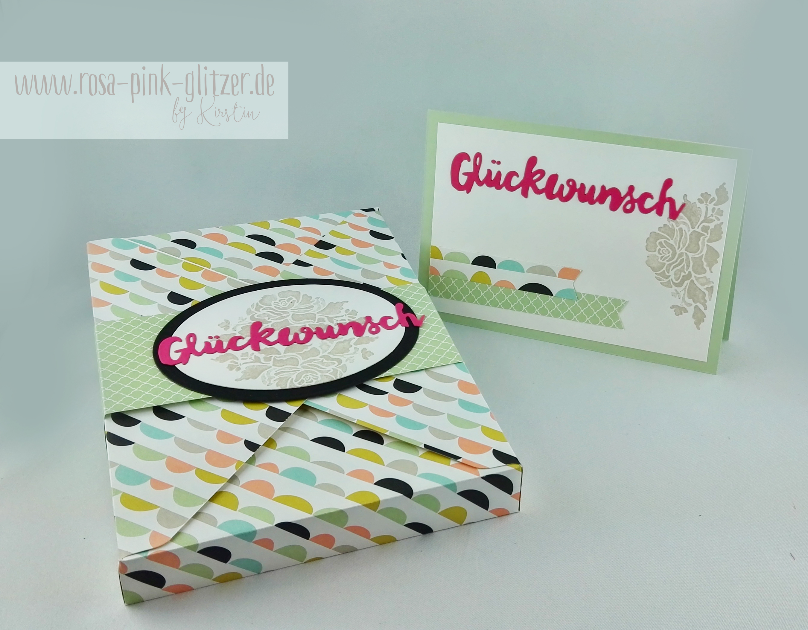Jedes Stempelset erhielt sein eigenes Schächtelchen, welches ich mit dem Umschlagboard gemacht habe. Und dazu eine passende Karte. Der Schriftzug stammt aus dem Framelits-Set „Grüße voller Sonnenschein“. Das ist so toll und vielseitig!