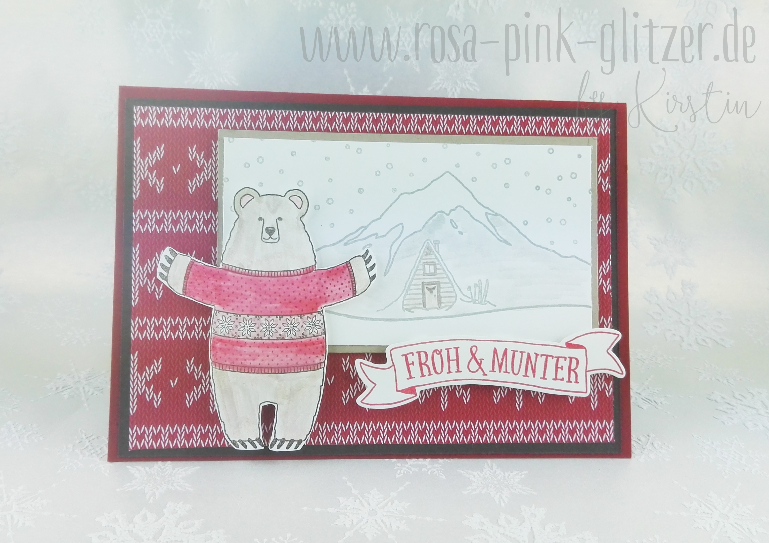 Bei mir ist wieder der Hüttenbär los. Der passte einfach zu gut zu dem Thema, genau wie das Designerpapier im Block „Gemütliche Weihnachten“. Und dazu die schönen Berge aus dem Set „Mountain Adventure“ aus dem Stampin‘ Up! Herbst-Winterkatalog.