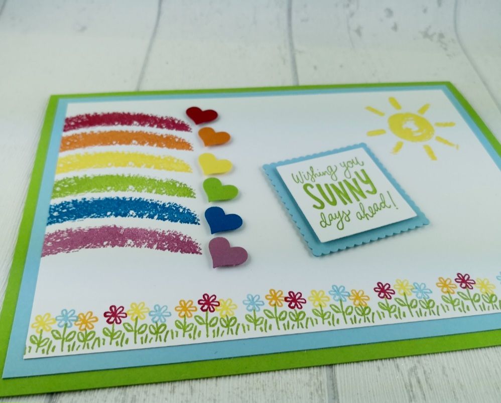Als ich überlegt habe, ob ich noch nen Spruch stempeln soll, fiel mir das Stempelset „Hinterm Regenbogen“ in die Hände. Und mal ehrlich – dieser Spruch passt doch wie die Faust aufs Auge.