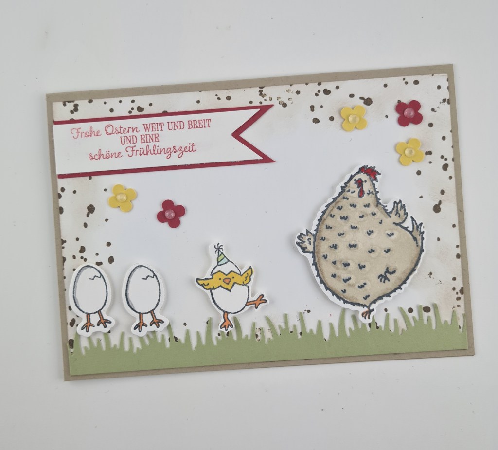 Meine Karte ist eine fröhliche Hühner-Karte geworden: