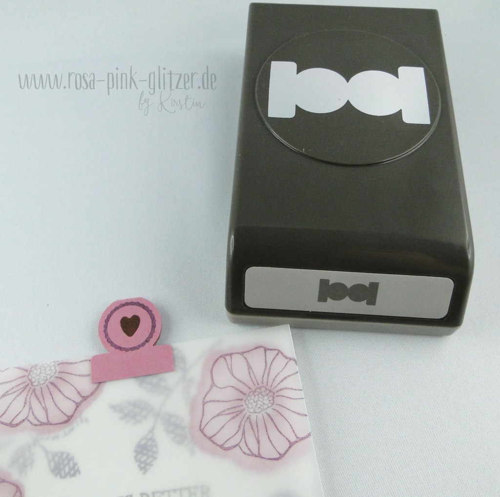 Und hier seht Ihr auch schon den Überraschungseffekt. Und nicht nur das, gleich noch ein neues Produkt. Ist Euch der „Rauszieher“ aufgefallen? Das ist eine neue Stanze – ein runder Karteikartenreiter. So toll! Und so vielseitig! Damit zeig ich Euch noch einige tolle Sachen. Und ja, auch die Stanze hab ich für die Gestaltung der OnStage-Schauwände bekommen. Die kleinen Stempelchen stammen aus einem Stempelset, das alle Teilnehmer von Stampin up OnStage bekommen haben und die perfekt zur Stanze passen.