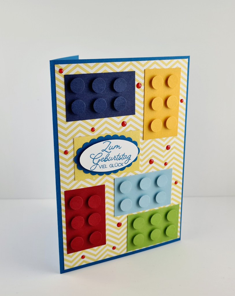 letztens brauchte ich schnell eine Karte für einen Kindergeburtstag. Nachdem der Kleine Lego liebt, war schnell klar, wie die Karte wird. Die Farben hat übrigens mein Sohn so für seinen Freund ausgesucht.