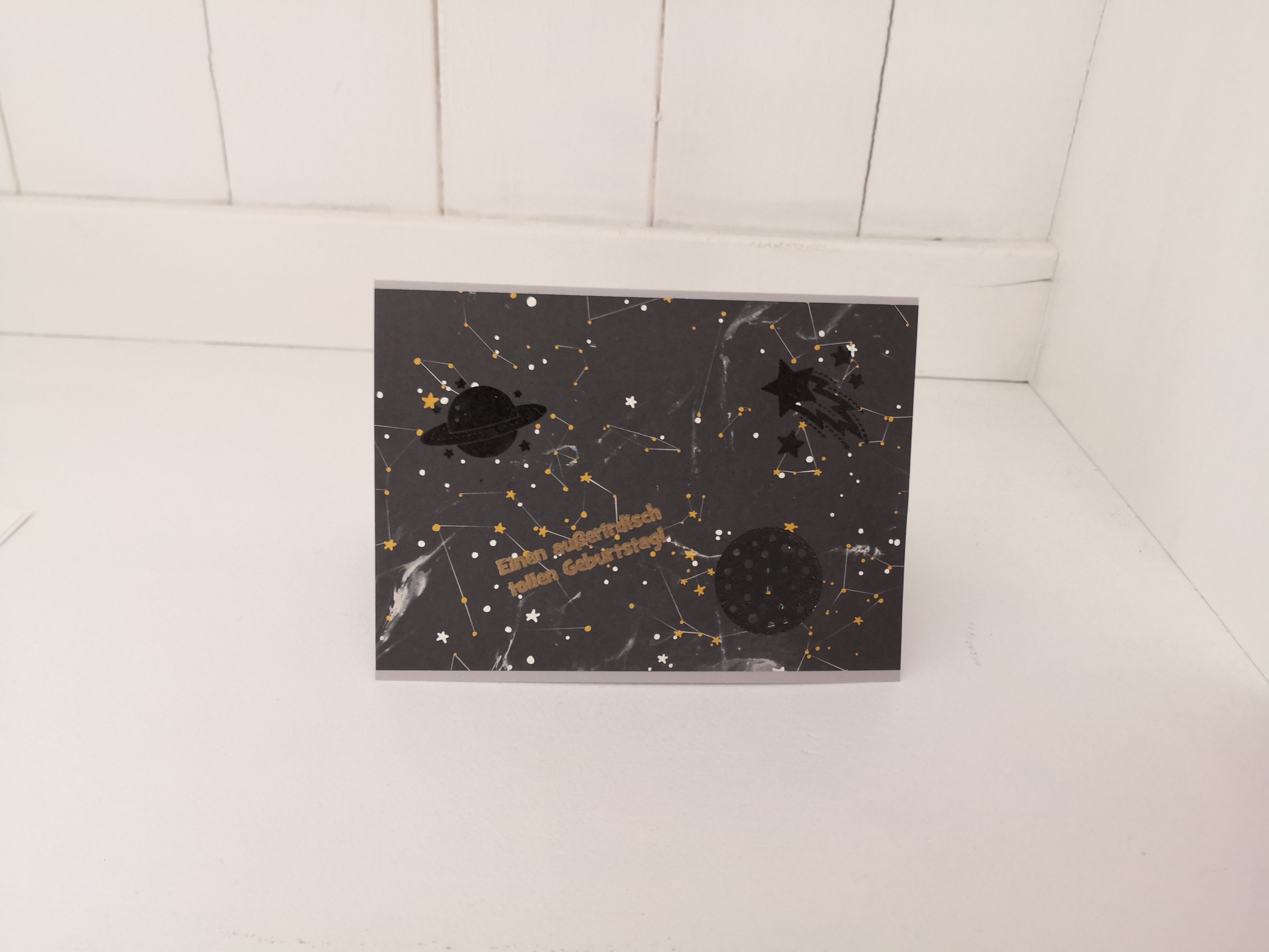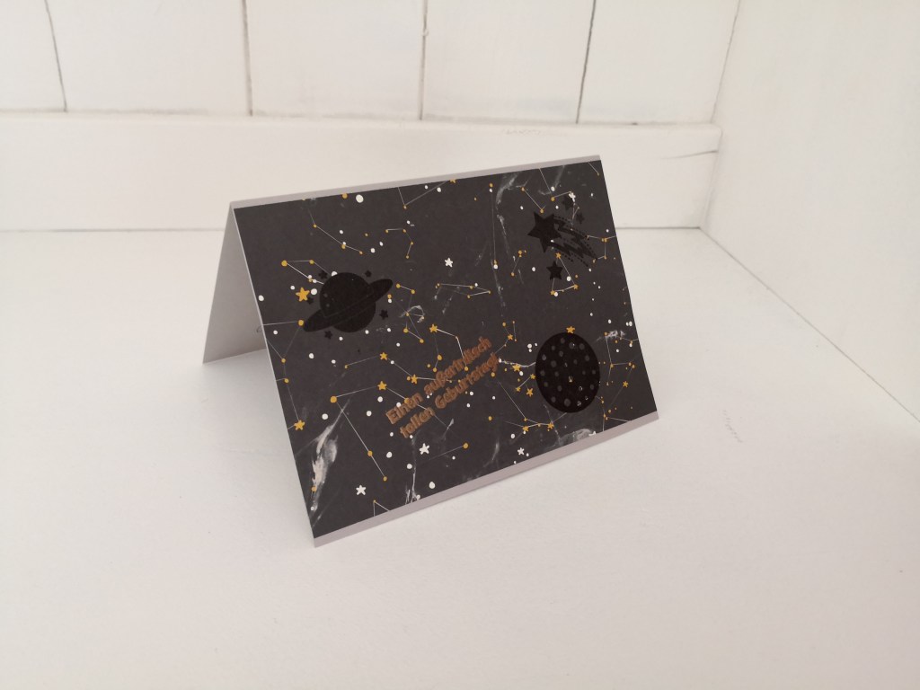 Hallo Ihr Lieben, heute zeige ich Euch eine Karte, die auf meinem Handy fast untergegangen wäre. Eine schnelle Karte zum Weltraum-Geburtstag. Designerpapier, Embossing – fertig 🙂