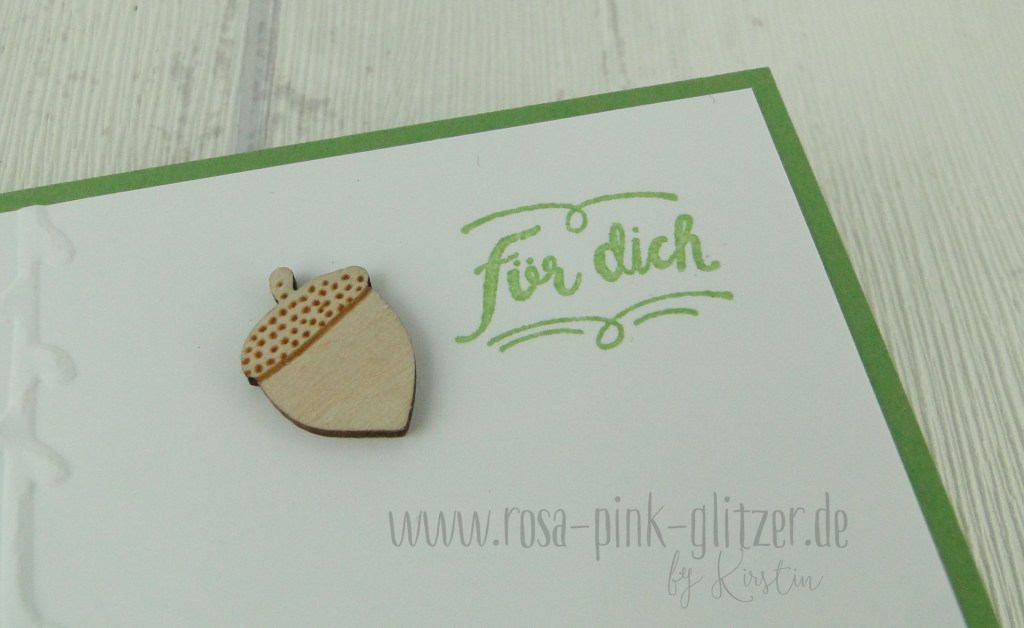 Der kleine Spruch stammt aus dem Stempelset „Kreativkiste“, das uns zum Glück auch im neuen Stampin up Jahreskatalog erhalten bleibt. Die kleine Holznuss ist aus meinem Fundus und passte einfach so perfekt. Müsst Ihr auch irgendwie gleich an Scrat aus Ice Age denken?
