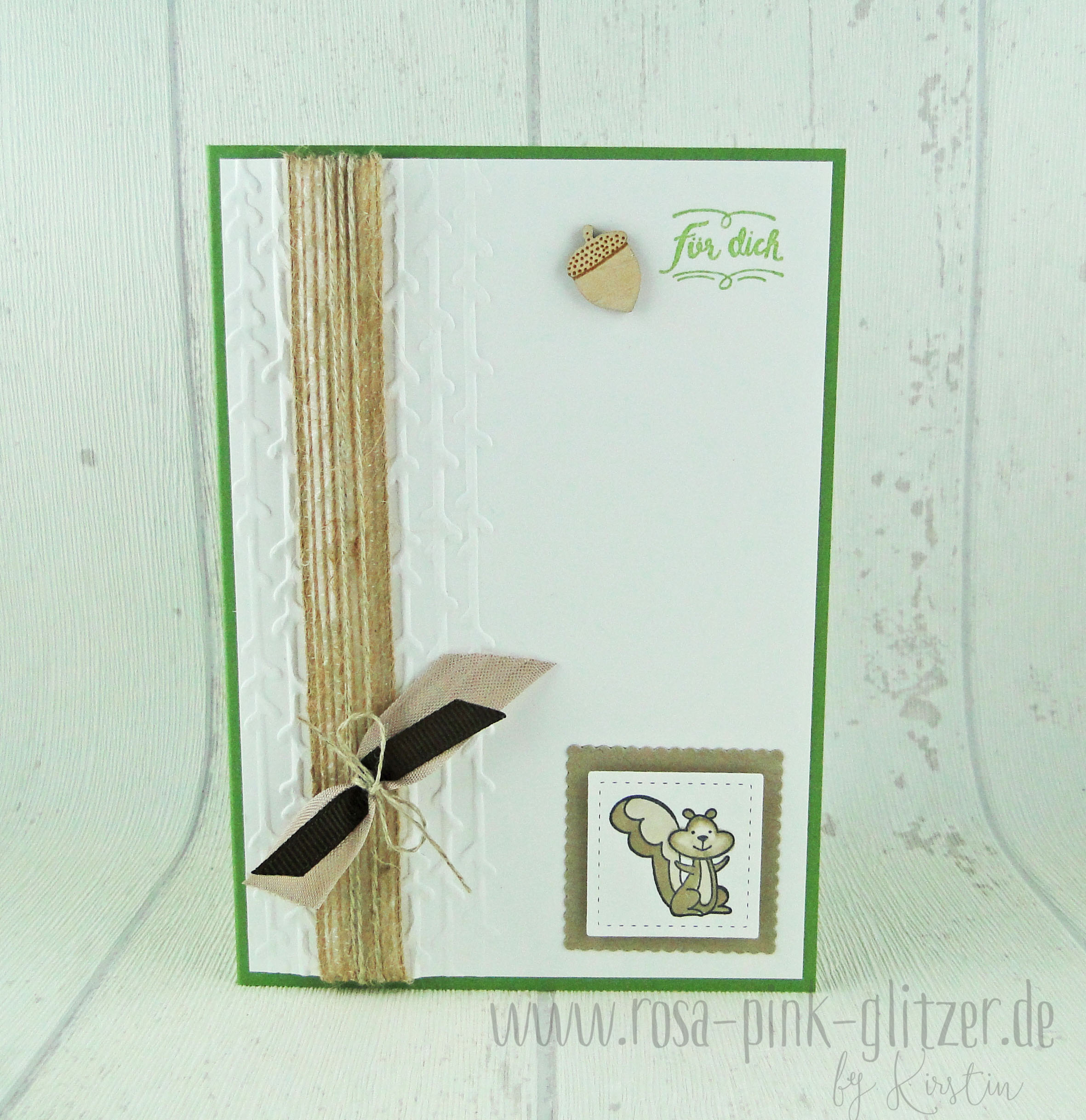 Ich mag den natürlich Look der Karte, der durch die Farben entsteht. Das Jute-Band passt da natürlich optimal.