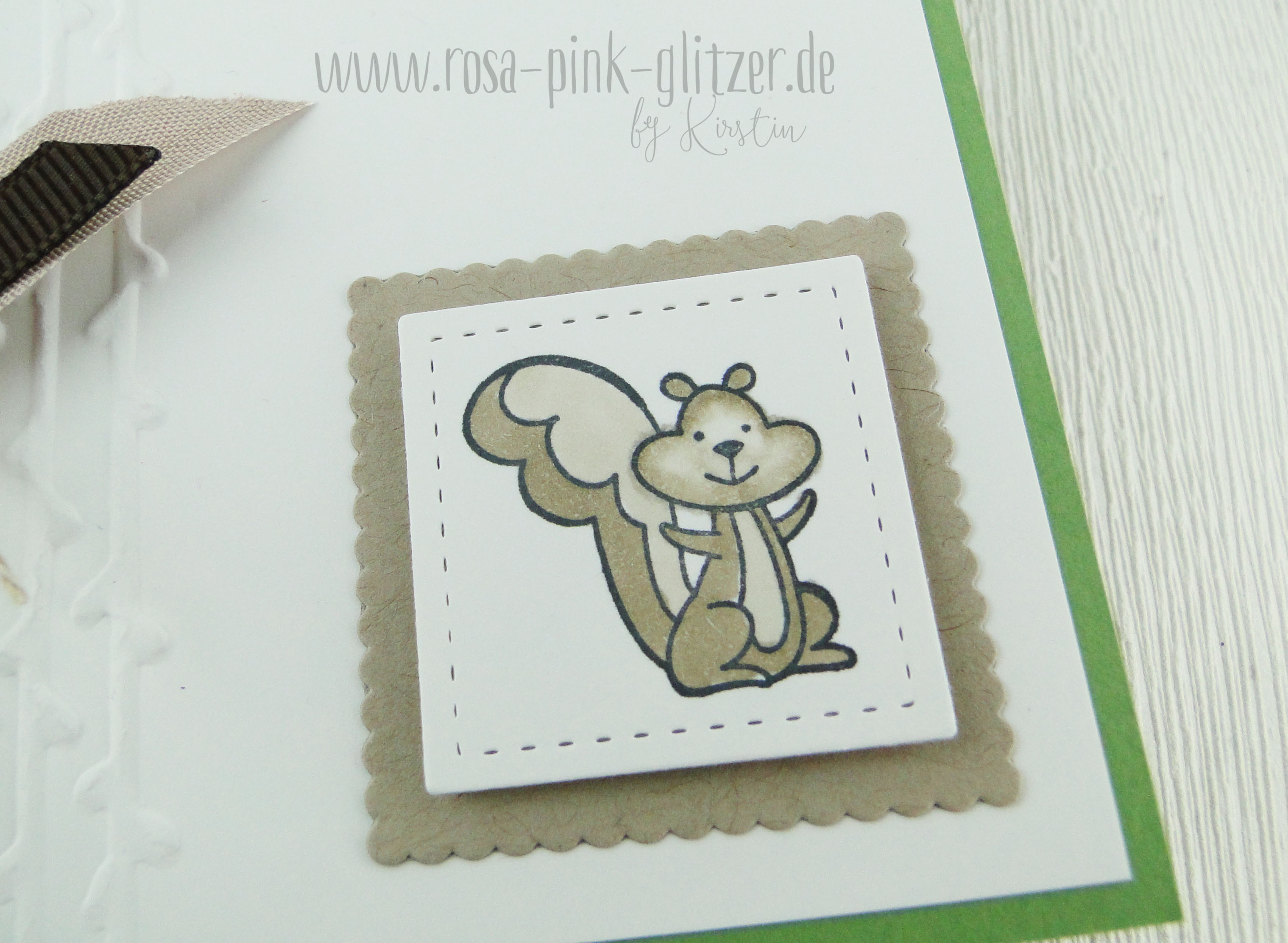 Ist das kleine Eichhörnchen nicht niedlich? Ich bin ganz verliebt. Und so ganz alleine in Szene gesetzt fällt es doch auch mal richtig auf. Sonst sieht man ja meist die Viererbande im Einsatz. Na, kommt Ihr drauf, aus welchem Stempelset es stammt? Genau „We must celebrate“ aus dem noch gültigen Stampin up Frühjahrskatalog. Die lagenweise Quadrate habe ich mir während der Sale-a-bration gegönnt. Hab mich lang dagegen gewehrt 😉 Denn auch, wenn ich Quadrate ja schon zuschneiden kann – mit der Wellenlinie tu ich mich schwer.