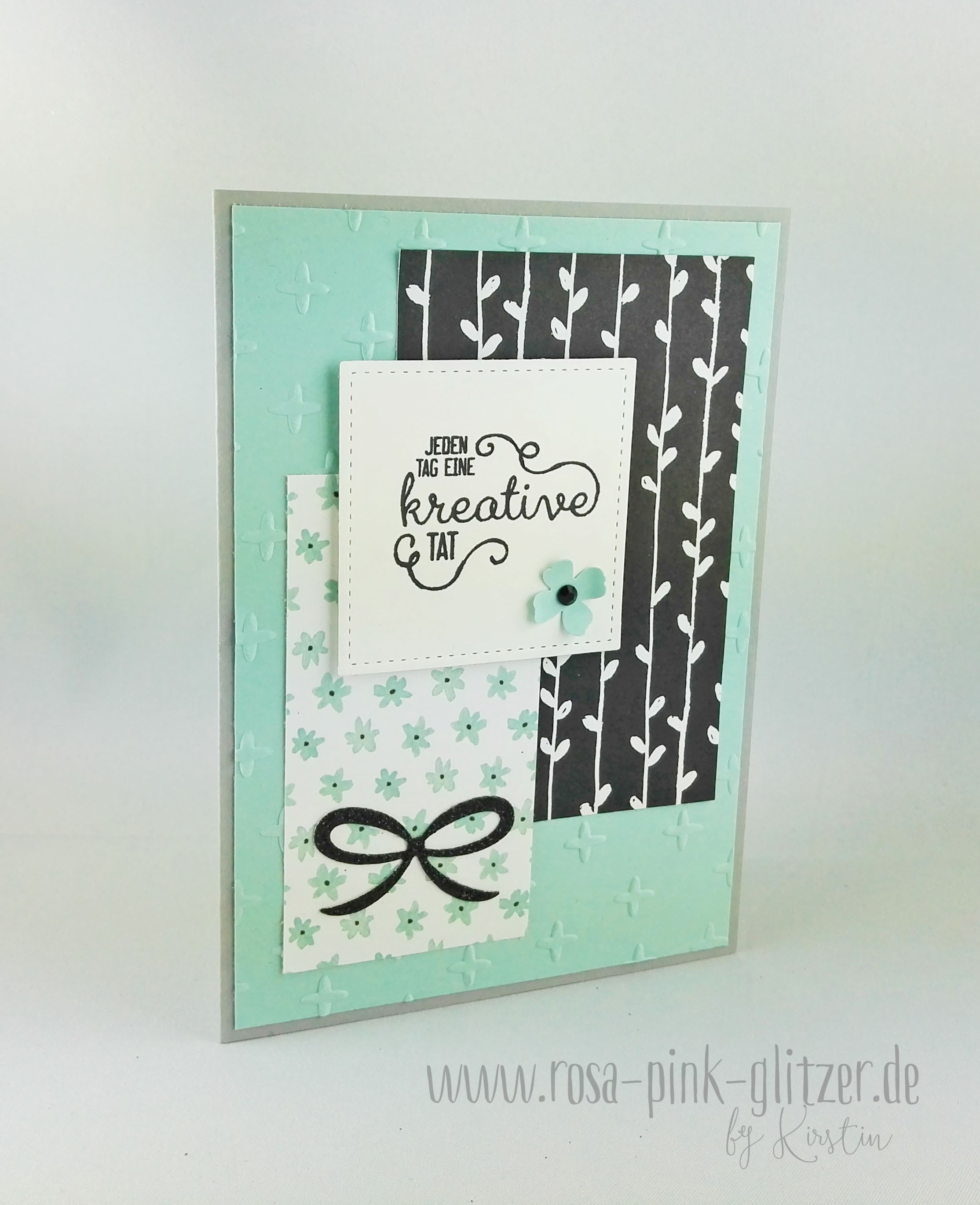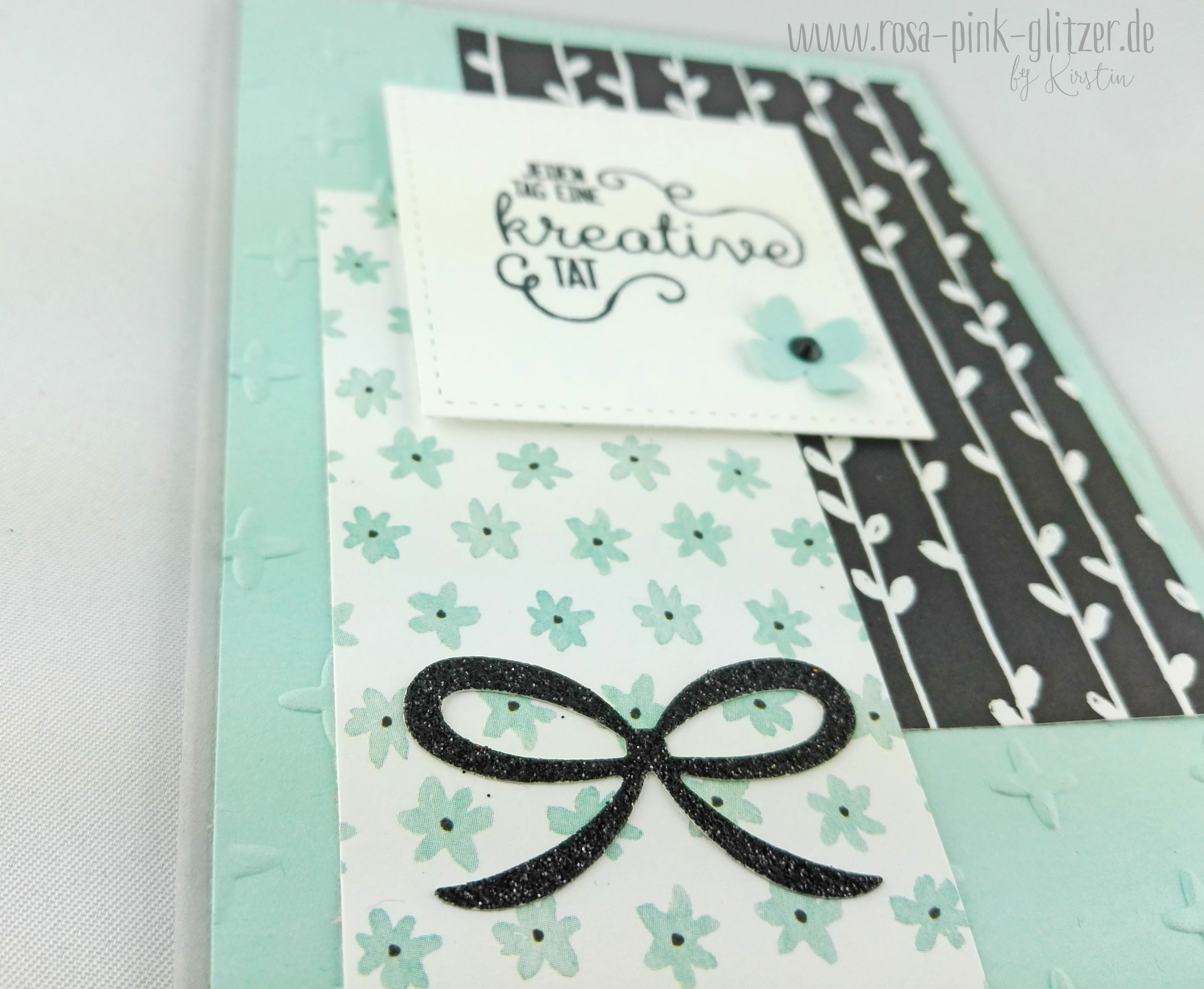 Als die Karte im Grunde fertig war, fehlt mir aber noch etwas. Und so durfte noch die hübsche Schleife aus den Pretty Pines Thinlits, ausgestanzt aus Glitzerpapier in Schwarz, auf die Karte. Gibt ihr den letzten Schliff wie ich finde.