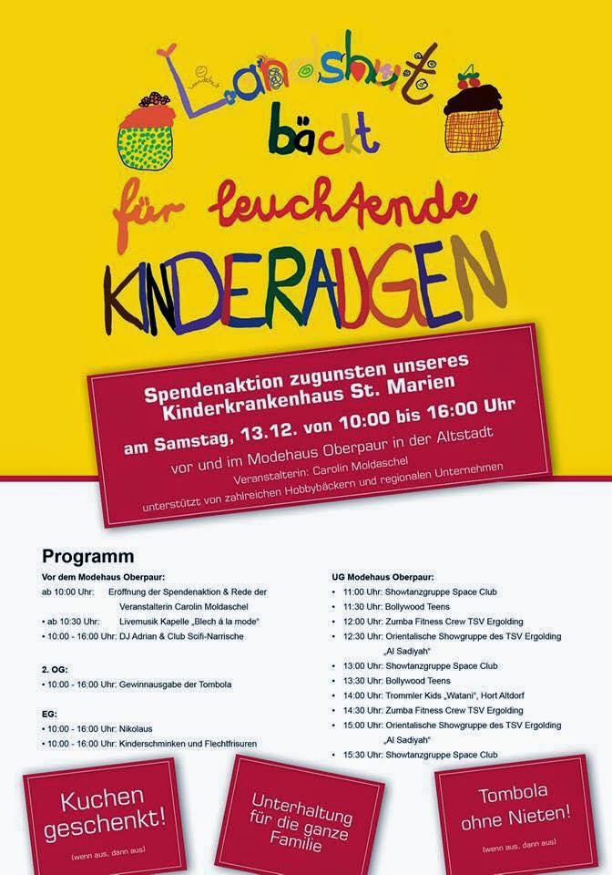 So, heute ist der große Tag: Vor dem Oberpaur in der Landshuter Altstadt könnt Ihr Euch von 10 bis 16 Uhr ein Stück Kuchen holen, gegen eine kleine Spende ein Los bekommen und damit die Aktion „Landshut bäckt für leuchtende Kinderaugen“ unterstützen. Ganz wichtig: Sowohl für Kuchen als auch für Lose gilt – solange der Vorrat reicht.